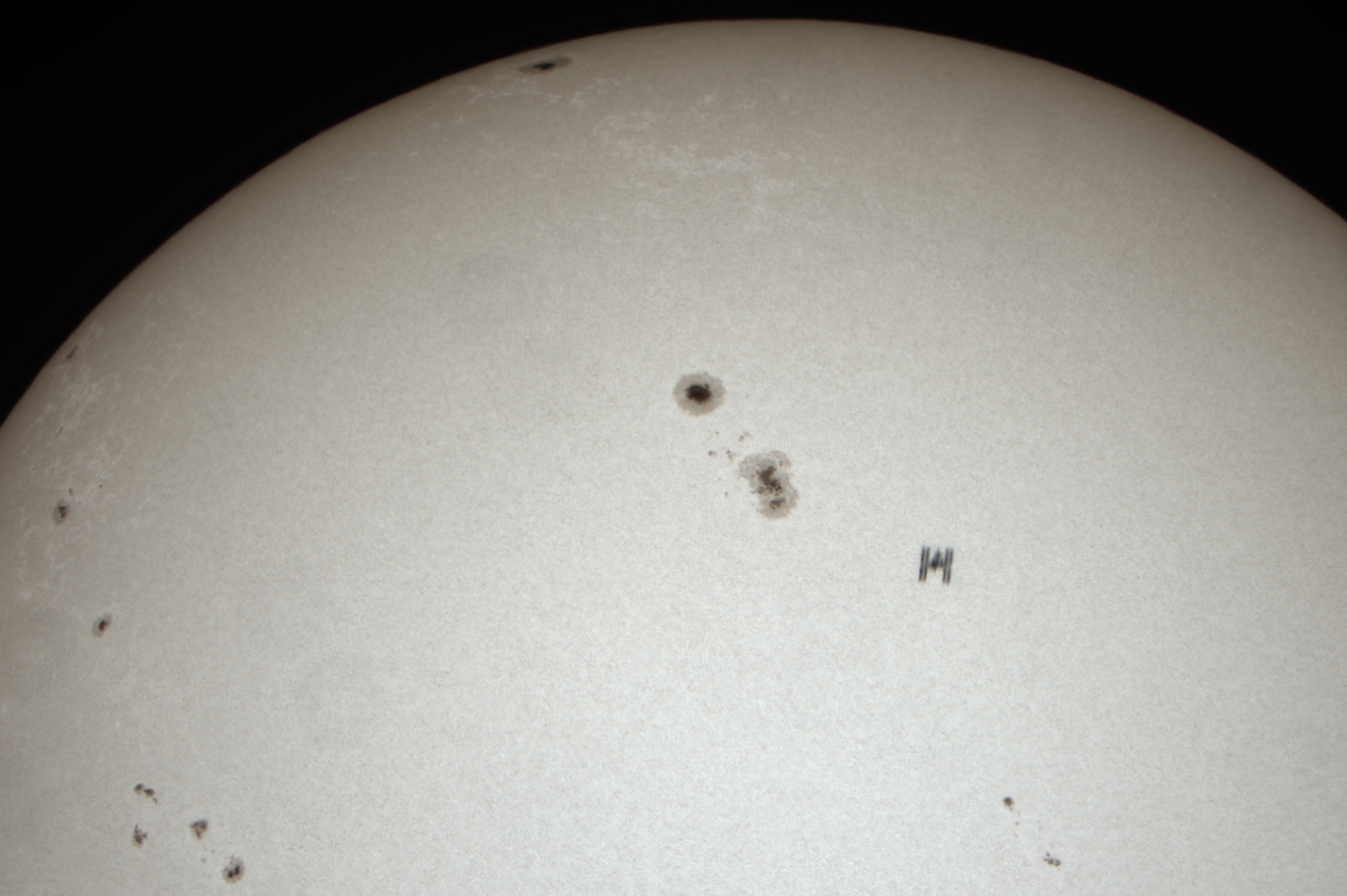 Transit der ISS vor der Sonnenscheibe, aufgenommen von einem Standort fast auf der Zentrallinie, zusätzlich schöne Sonnenfleckengruppen. Heinz-Reinhardt-Sternwarte St. Ottilien