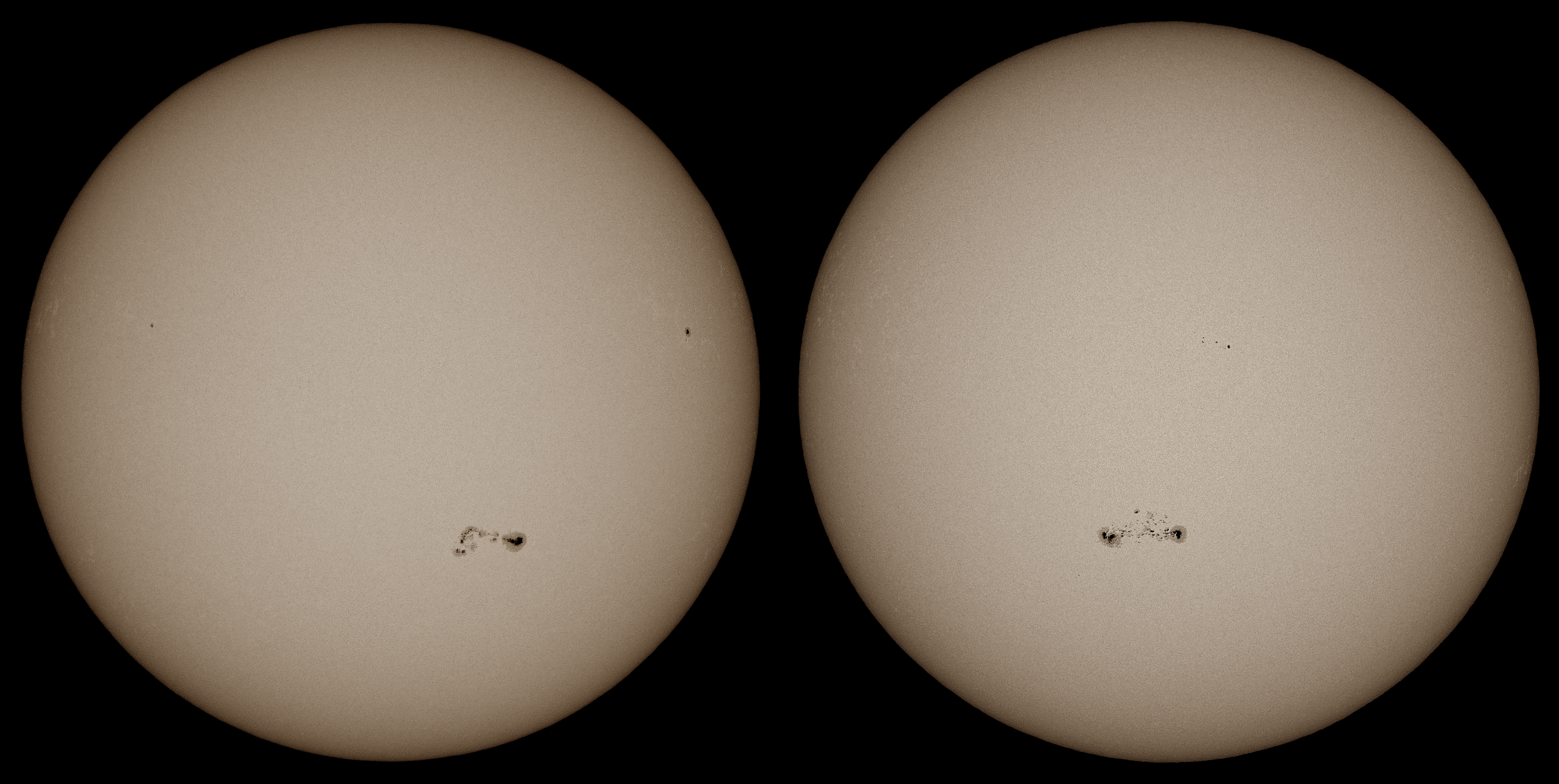 Zwischen den beiden Aufnahmen im August liegen genau zwei Wochen. Die Sonnenbilder sind etwa in Nord-Südrichtung ausgerichtet, man gewinnt den Eindruck, das sich die Sonnenaktivität auf dem selben Breitengrad abspielt.