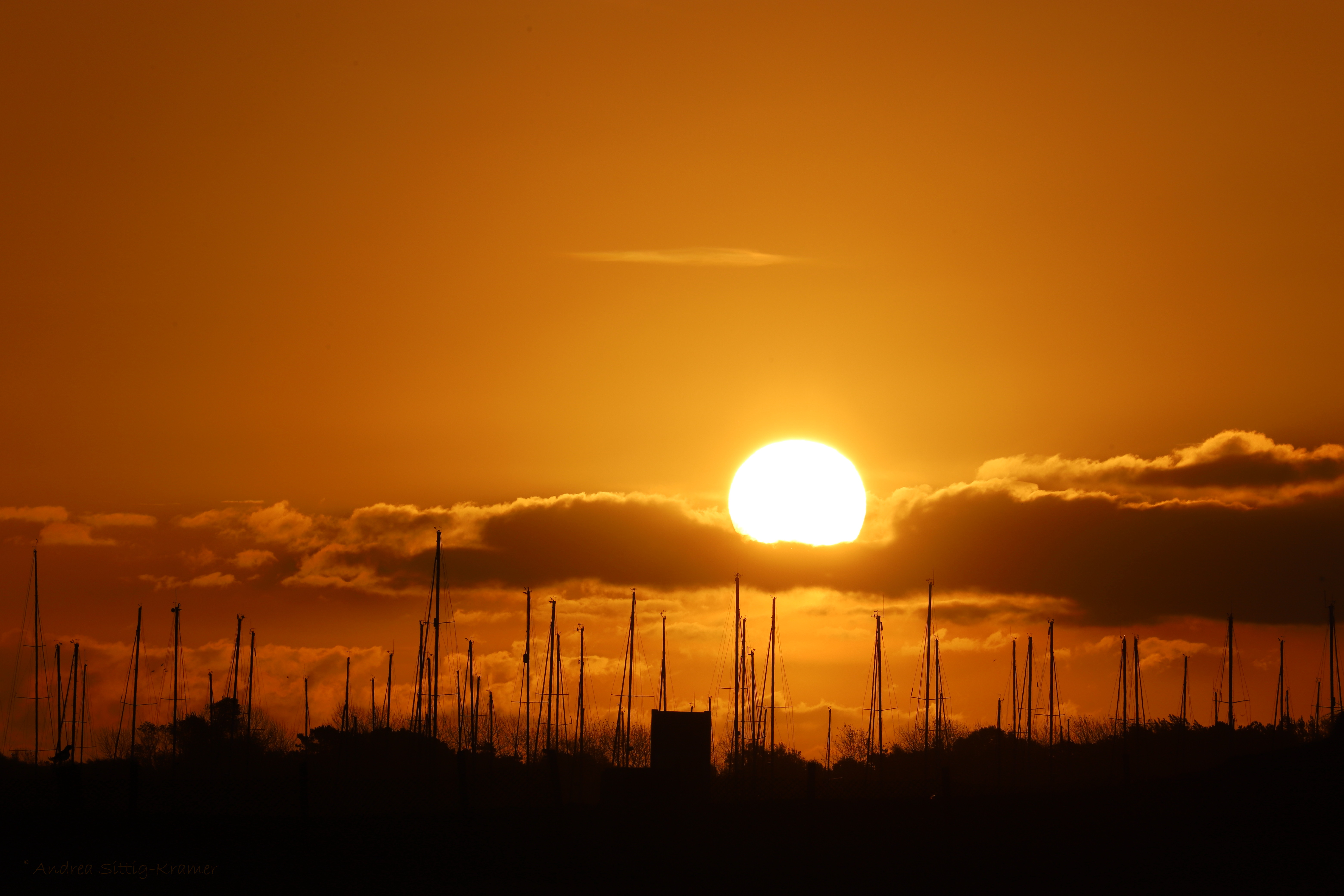 Diesen wunderschönen Sonnenaufgang konnte ich am Morgen des 14. Oktober 2019 am Strand des Ostseebades Warnemünde aufnehmen. Vor dem gelb-orange-rot leuchtenden Horizont zeichnen sich kontrastreich die Masten der Segelboote im Hafen ab.