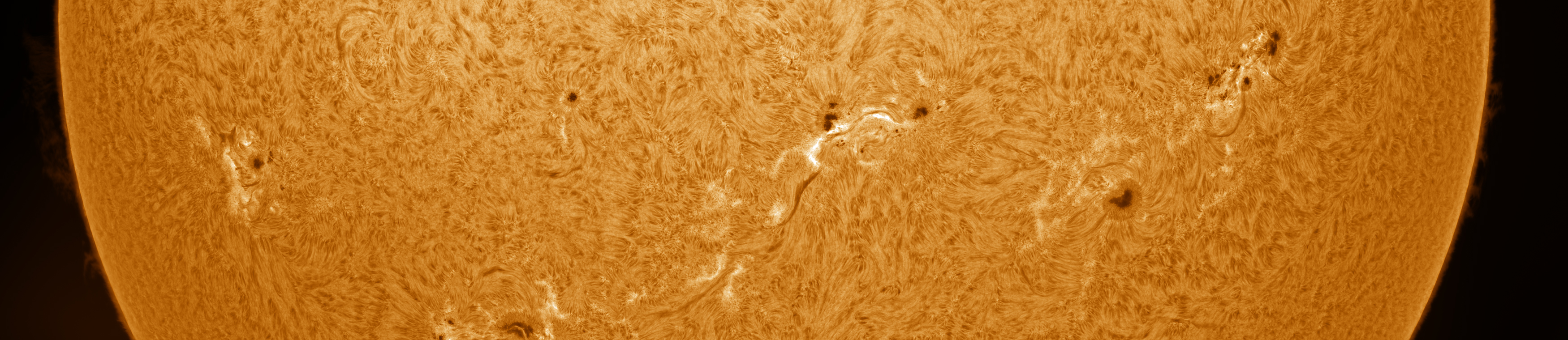 Fünfteiliges Panorama von Ost nach West im Licht der Wasserstoffemissionslinie mit all den prachtvollen Fleckengruppen vom aktuellen Sonnenmaximum.