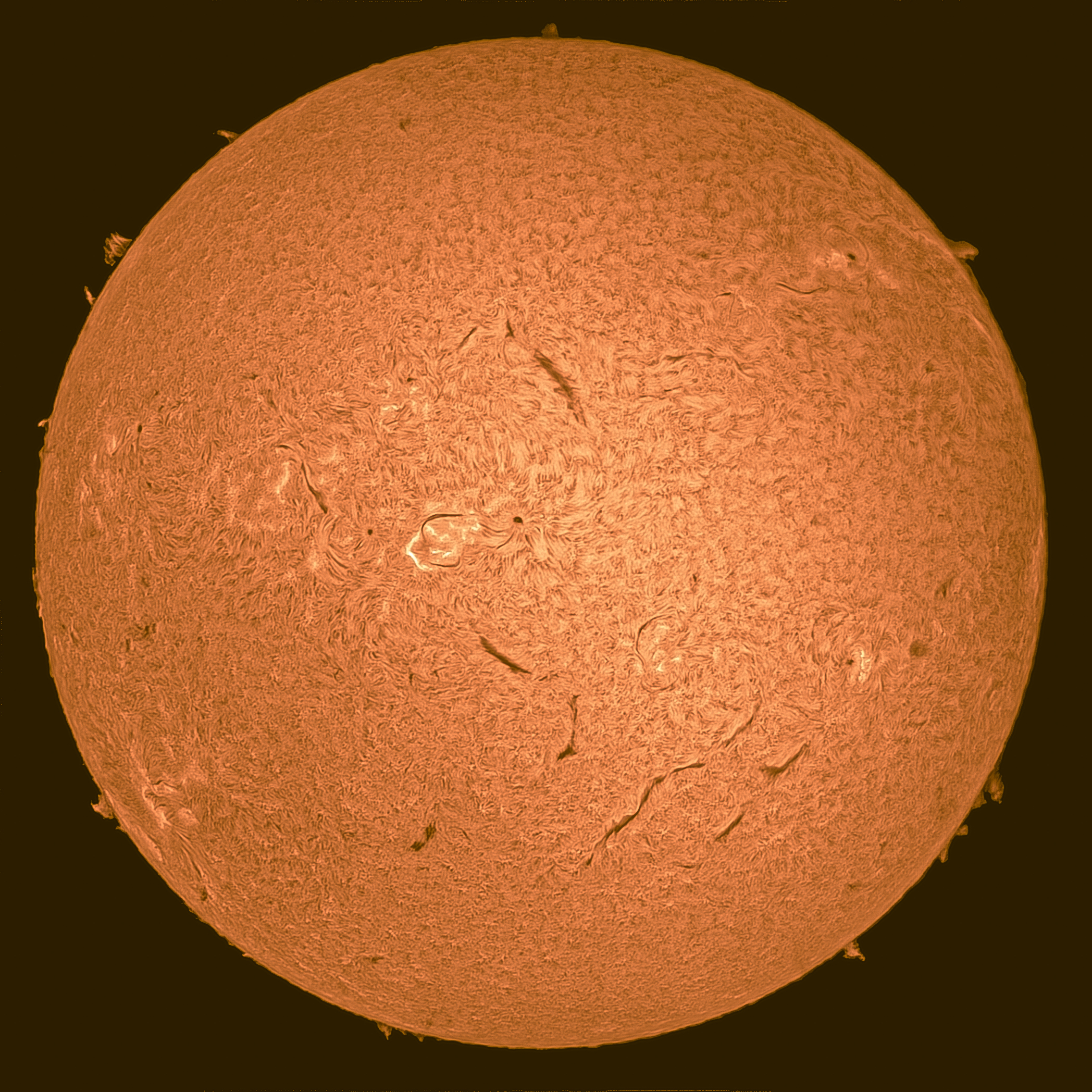 Sonnenbeobachtung im H-Alpha-Bereich: Schon am Sonntagmorgen kaum Luftunruhe, so dass die zahlreichen Protuberanzen und Filamente sowie sechs Sonnenfleckengruppen gut zu beobachten waren.