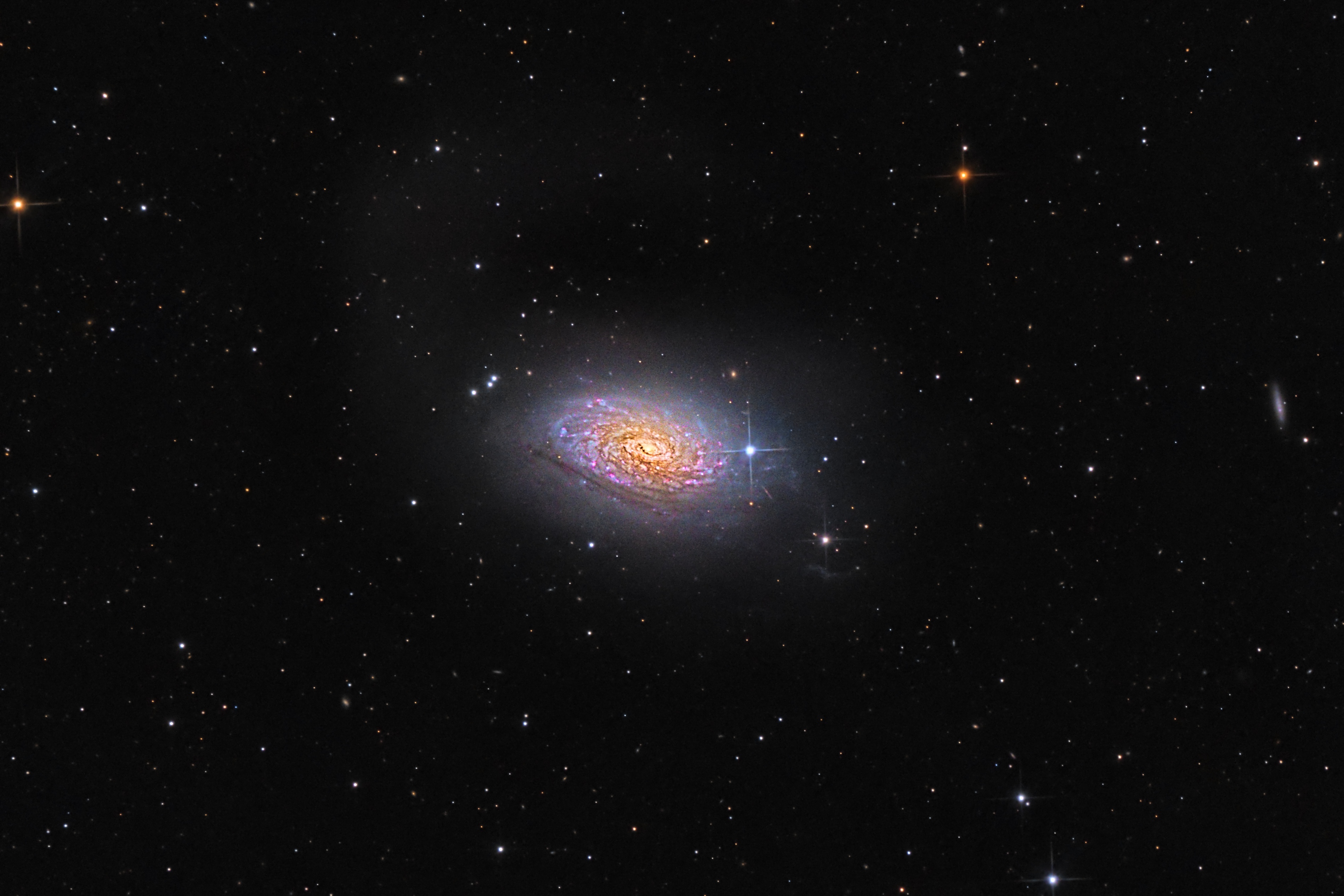 Diese Galaxie im Sternbild Jagdhunde fällt durch die Knötchen in den Spiralarmen auf, die bei Aufnahme mit einer astromodifizierten Kamera rötlich erscheinen. Es handelt sich um Sternentstehungsgebiete und Gaswolken.