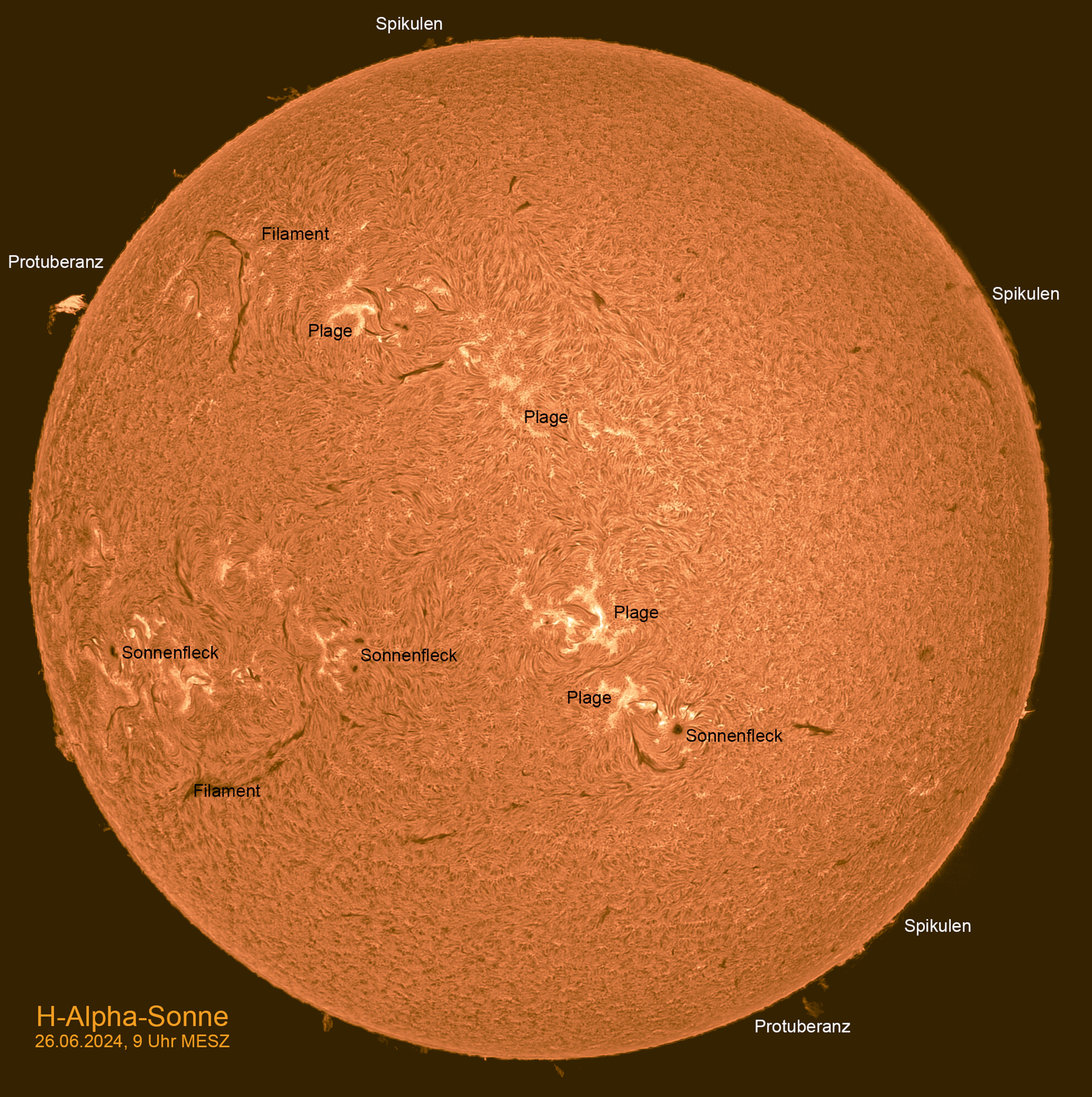 Vielfältige Erscheinungen der Chromosphäre konnten heute wieder aufgenommen werden. Die Luftunruhe war gegen 9 Uhr sehr gering, so dass jeweils 1000 bis 3000 Frames gute Ergebnisse brachten. Mit SharpCap und AutoStakkert vom AVI zum scharfen Einzelbild ermöglichte eine detailreiche Abbildung.