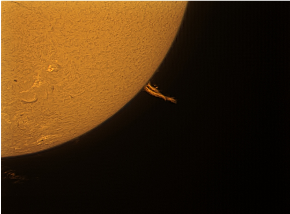 Überlagerung von 2 Bildern (je 1000 Frames, ein Video mit 1/1000 Sekunden Belichtung für die Sonnenoberfläche und ein Video mit 1/700 Sekunden Belichtung für die Fackel).