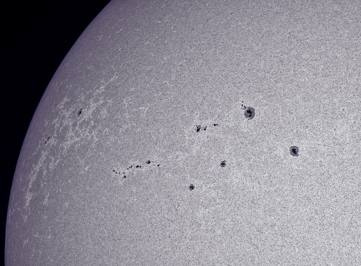 Fünf Fleckengruppen mit umgebenden Fackelgebieten am 24. April 2024. Aufnahme mit Kalziumfilter. Die hellen Fackelgebiete sind ca. 1000°C heißer wie die Flecken.