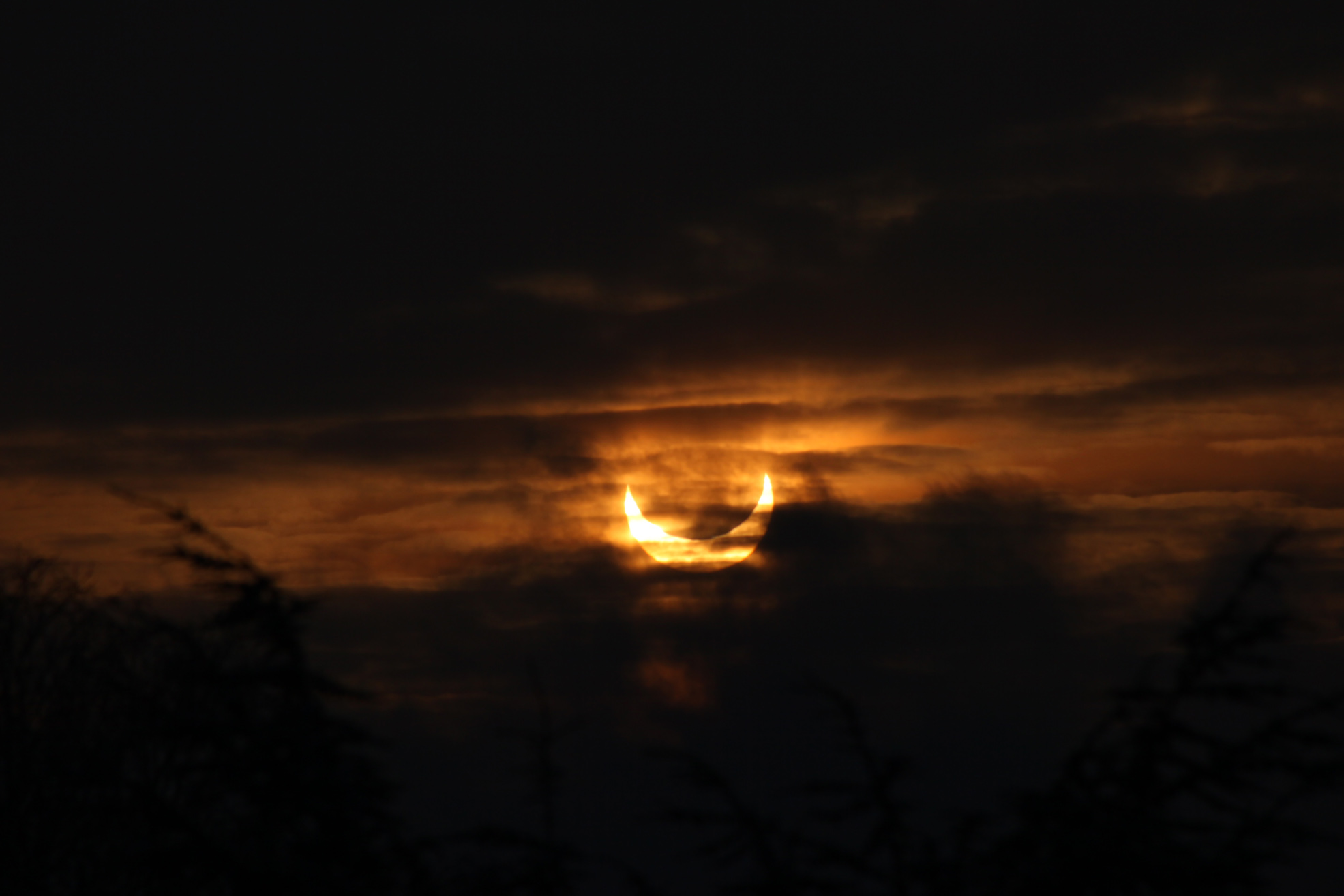 Nachdem bei einem ansonsten weitgehend klaren Himmel ausgerechnet im Süden dichte Wolken hingen, wollte ich den Versuch, die Finsternis aufzunehmen, bereits abbrechen. Doch dann rissen die Wolken für einen Moment auf und gaben den Blick auf die maximal verfinsterte Sonne frei. Dabei gelang dieses Bild.