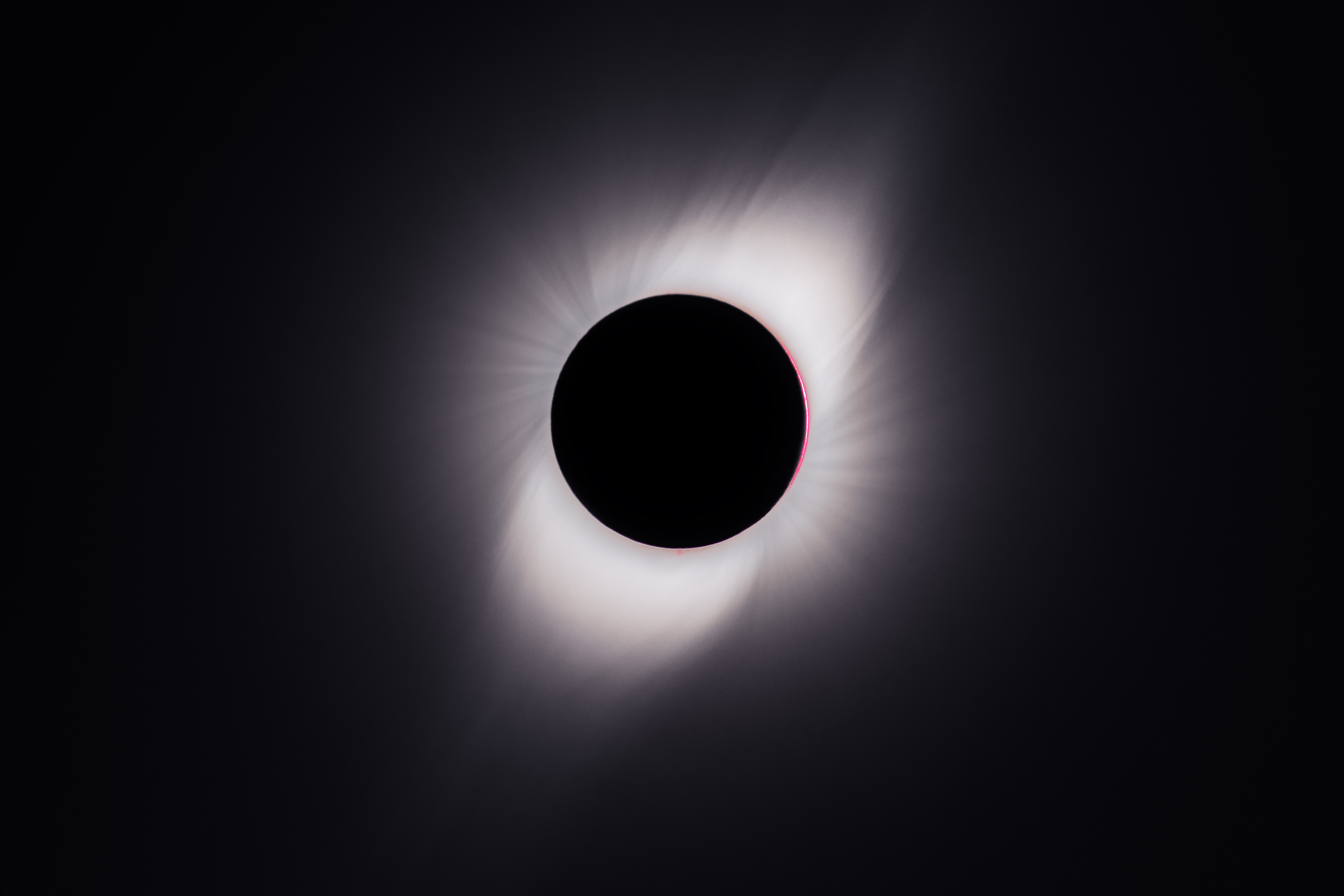 Meine erste totale Sonnenfinsternis durfte ich in Chile am 2. Juli 2019 erleben. Die Aufnahme entstand in der Nähe der Sternwarte La Silla. In der Phase der totalen Verfinsterung zeigt sich die heiße Korona. Aufgrund des zur Zeit bestehenden Sonnenfleckenminimums ist das Magnetfeld der Sonne nur wenig gestört, und man erkennt sehr schön die beiden Pole, an denen die Feldlinien austreten.