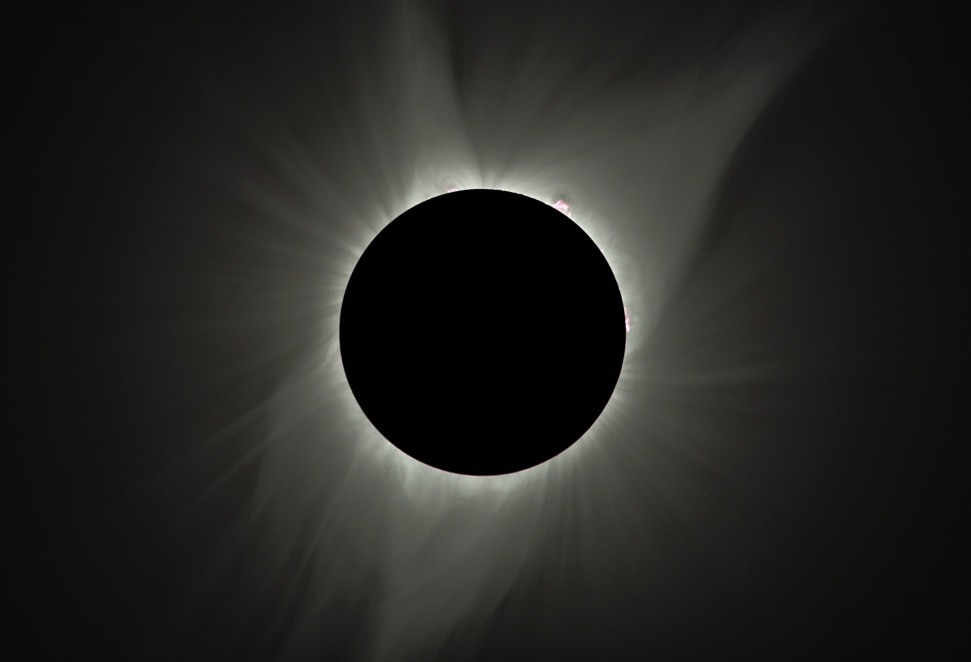 Addition zweier unterschiedlicher Belichtungen. Einmal kurzbelichtet für Protuberanzen und innere Korona und einmal eine längere Belichtungszeit gewählt für die äußere Korona.