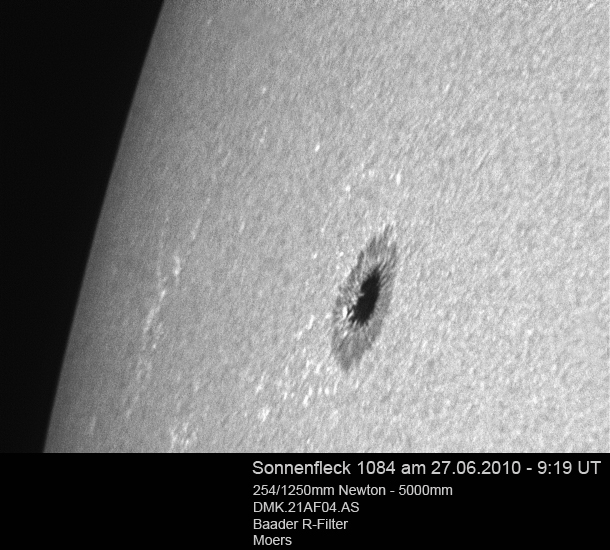 Am 27.6.2010 konnte ich unter sehr guten Bedingungen den Sonnenfleck 1084 aufnehmen, der gerade einen Tag zuvor am Sonnenrand erschienen war.