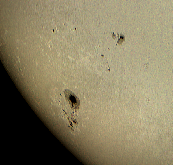 Als Ergänzung zu meinem H-alpha-Bild vom 3.7.2014 habe ich noch ein Bild dieses Flecks im Weißlicht gefunden, das man zeigen kann. Über das Seeing war ich ziemlich enttäuscht; diese Aufnahme geht aber noch, um einen Eindruck "des Dicken" zu bekommen. Gerade "um die Ecke" gekommen, ist der Kontrast der hellen und dunklen Gebiete ausgeprägt.