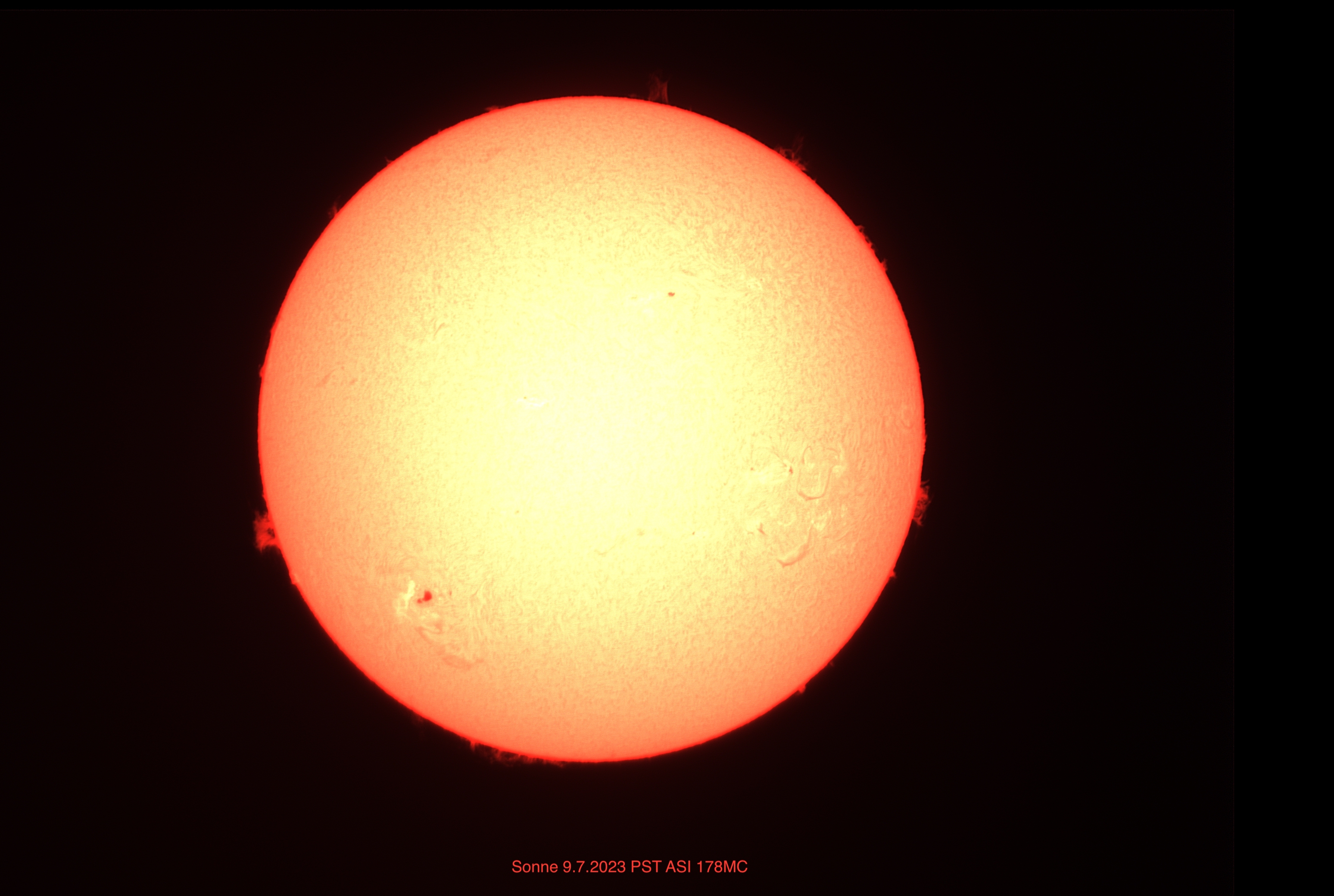 Ganze Sonne durchs PST aufgenommen am 9. Juli 2023 bei ruhiger Luft und nur leichter Bewölkung. 20% von 1000 Frames verwendet.
