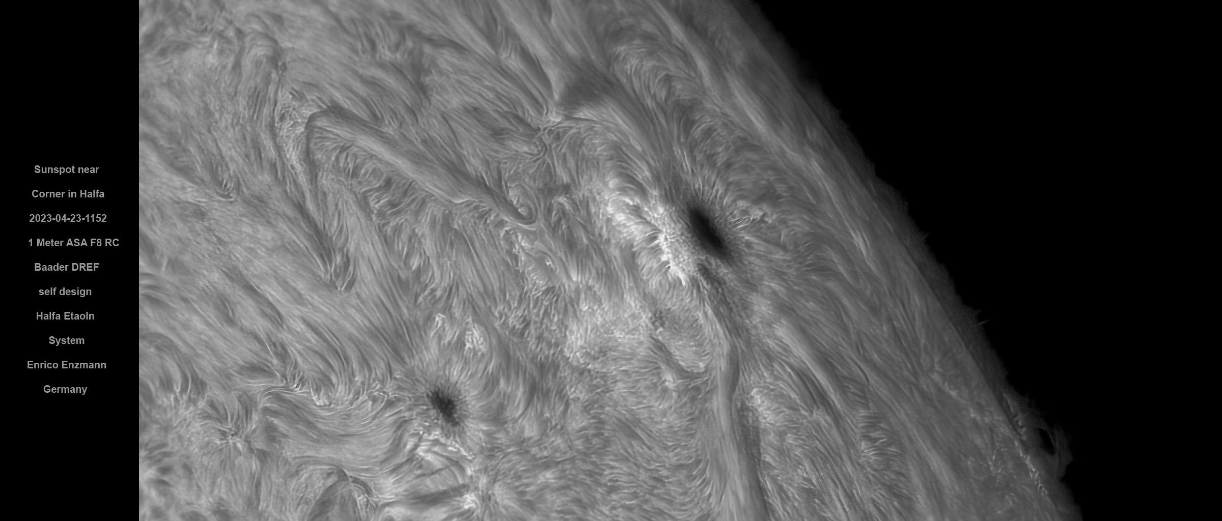 Wie bereits das Bild vom 22. April 2023 ist auch dieses Bild einen Tag später in einer kurzen Wolkenlücke gegen 14 Uhr Ortszeit in H-Alpha aufgenommen worden. Das Seeing war nicht ganz so gut wie den Tag zuvor aber es reicht um viele Oberflächendetails im Bild sichtbar zu machen.