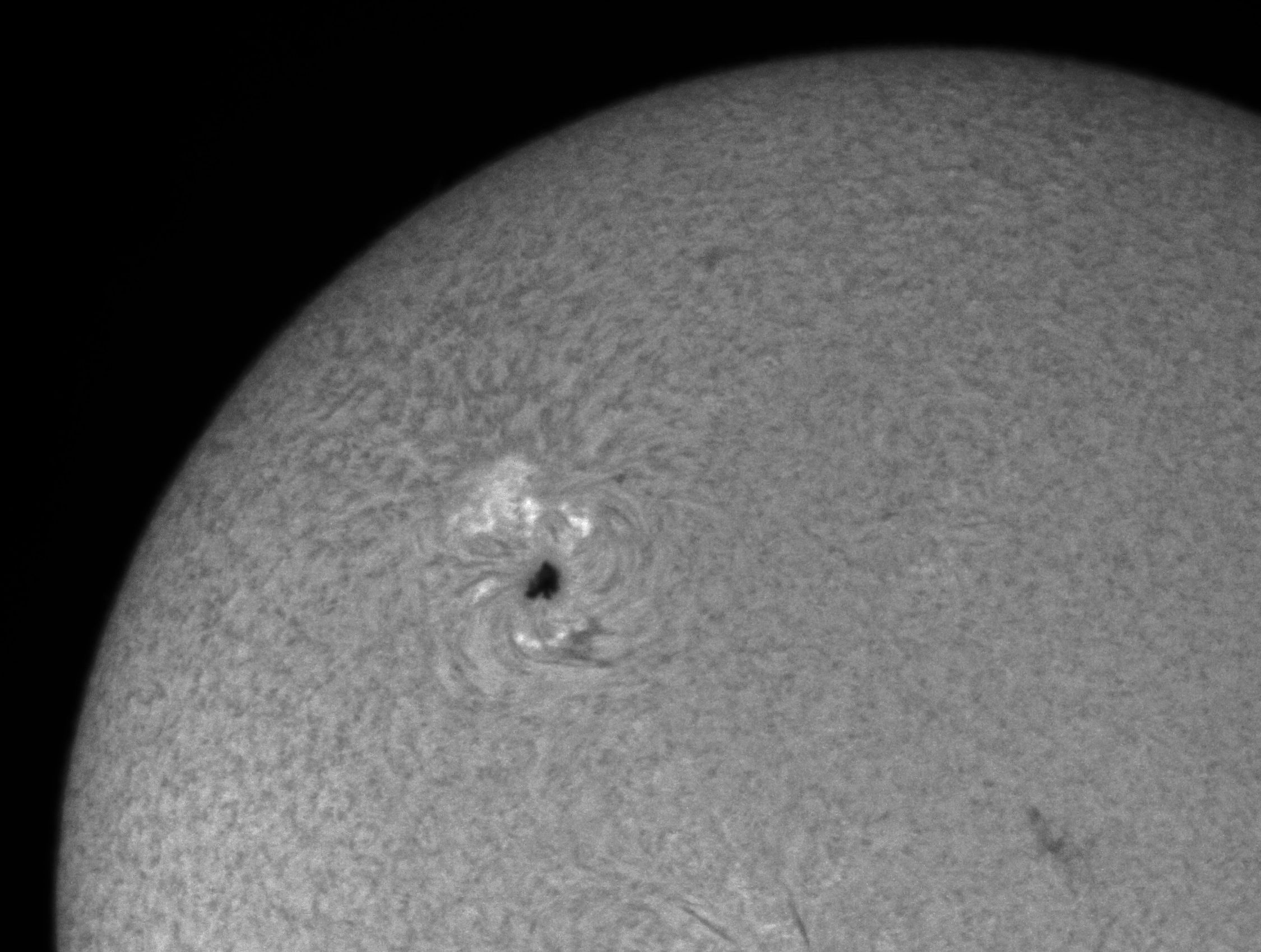 Seit Kurzem beobachte ich die Sonne im H-Alpha-Licht. Das Bild zeigt den Fleck AR12529 am 11. April 2016 um 12:41 UTC. Besonders faszinieren mich daran die Details der Umbra und die strudelartigen Strukturen in ihrem Umfeld. Das Bild entstand mit einer Canon EOS 700D im Schwarzweiß-Modus an einem LUNT Ha-60-Sonnenteleskop, 2x-Barlow-Linse (f = 1000 mm), ISO 800, 1/10 Sekunde. Nachbearbeitung mit Fitswork.