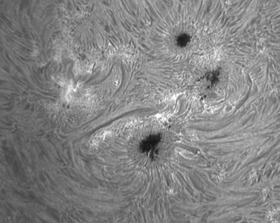 Sonnenflecken sind im H-alpha-Licht immer für eine Überraschung gut, wie hier mit einer Lichtbrücke beim größeren Fleck.