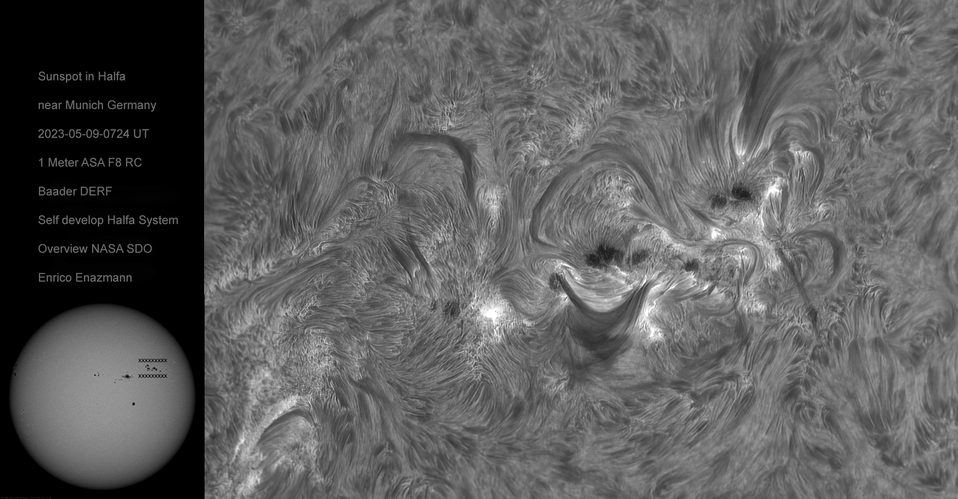Am 9. Mai 2023 gelang mir diese Aufnahme einer Sonnenfleckengruppe, siehe auch die Übersichtsaufnahme der NASA im SDO-Bild, wo die Position von mir markiert wurde.