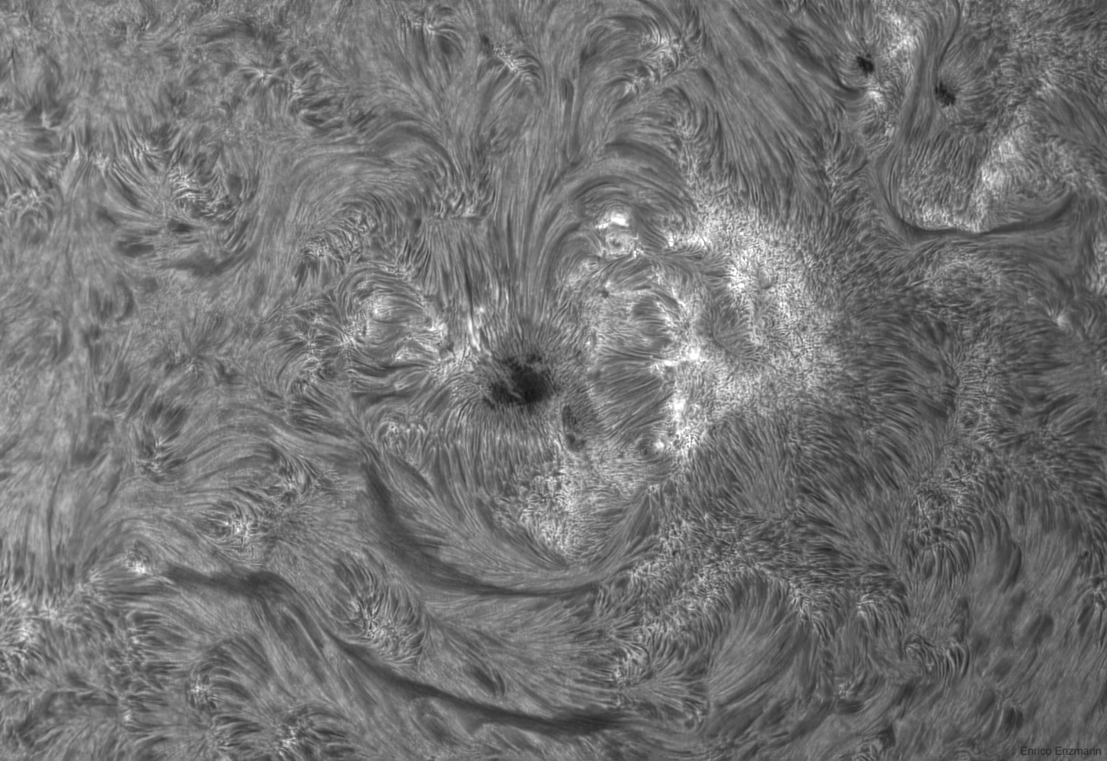 Ein hochvergrößerter Sonnenfleck in H-alpha vom 10. Juni 2024. Das Bild wurde mit einer Spezialanfertigung eines 290-mm-Baader-DERF gemacht. Im Teleskop ist ein von mir entwickeltes Etalon-System mit etlichen Filtern, Kipp und Drehvorrichtungen vorhanden, die für ein gutes Bild ohne Reflexe notwendig sind.