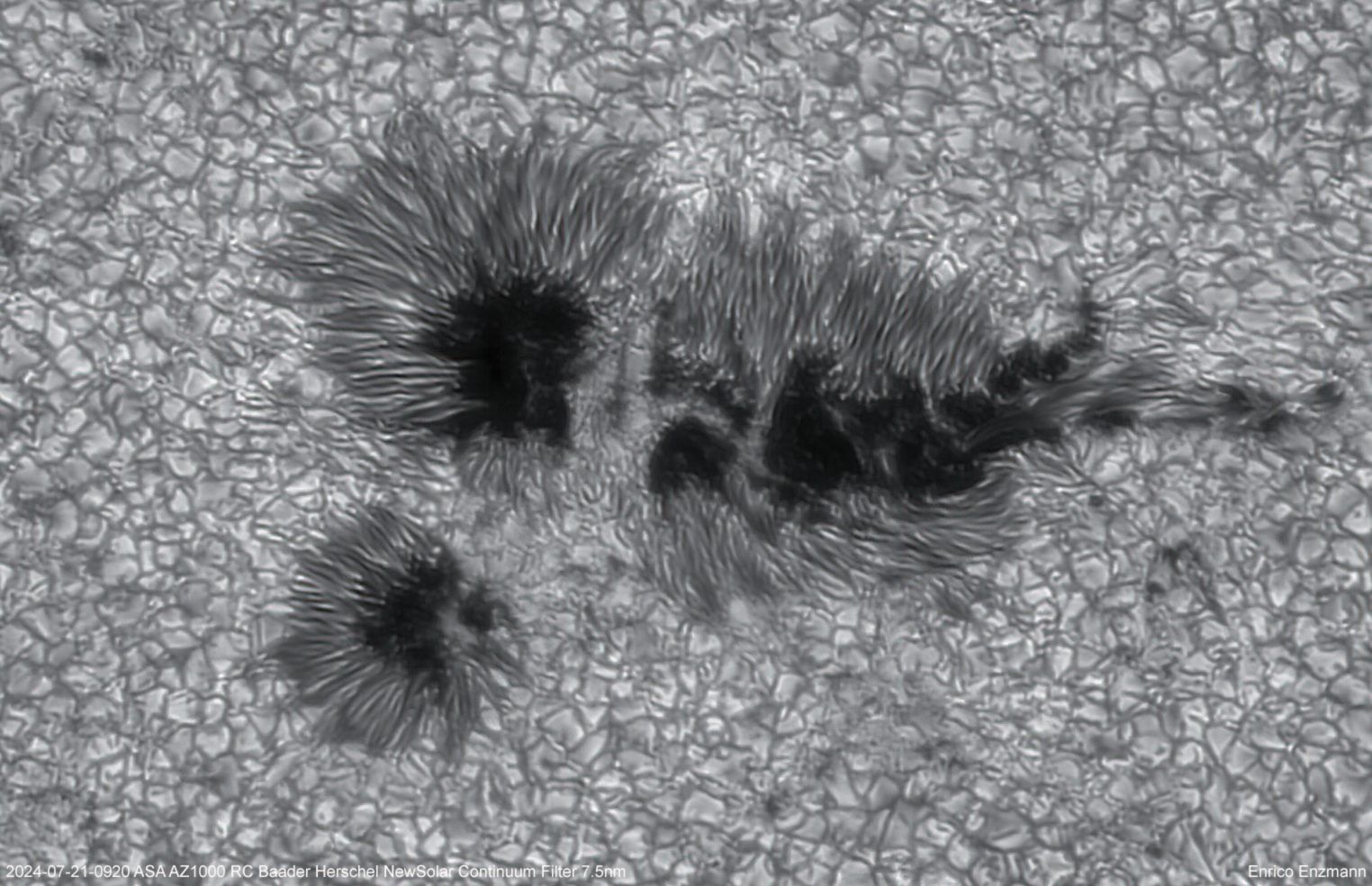 Am 21. Juli 2024 war das Seeing hier südlich von München stellenweise sehr gut und hat diese extreme Nahaufnahme eines Sonnenflecks ermöglicht. Das Teleskop wurde Off Axis auf 335 mm rund abgeblendet. Es wurde ein Baader-Herschel- sowie der neue Solar-Continuum-Filter von Baader mit nur noch 7,5 nm Bandbreite verwendet.