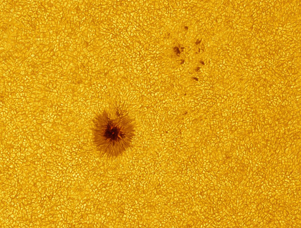 Am 03.09.21 konnte ich zum ersten Mal einen Sonnenfleck beobachten und fotografieren, bei dem sich eine komplett isolierte Lichtbrücke innerhalb der Umbra zeigt. Diese erscheint in dem Falschfarbenbild als rötlicher Punkt.