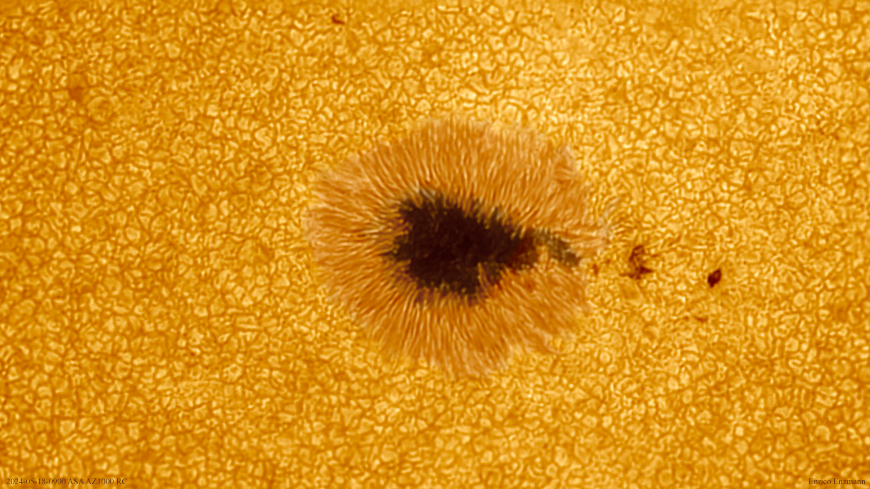 Normalerweise mache ich wie viele andere auch Sonnenflecken-Bilder in Schwarz-Weiß. Das ist die klassische Methode und ergibt die besten Kontraste. Nun hat es aber seinen Reiz, Sonnenflecken in Farbe darzustellen. Dazu hatte ich in der Vergangenheit öfters Bilder in einem Gold-Gelb-Braun Ton eingefärbt und hier veröffentlicht. Dabei hatte ich meist die sehr dunkle Umbra sowie die Penumbra und die Granulation separat bearbeitet, da damit die insgesamte Bildqualität gesteigert wurde. Meinem Freund Damian Peach, der weltweit durch seine sensationell guten Planetenbilder bekannt wurde, schicke ich immer wieder Bilder von mir, die er dann mit seinen Techniken bearbeitet. Dann vergleichen wir unsere Ergebnisse und/oder diskutieren, welche Möglichkeiten eine Verbesserung mit sich bringen können. hierbei kam Damian auf die Idee, nicht nur die drei unterschiedlichen Bereiche, was Helligkeit, Kontrast und Schärfe angeht, separat zu berechnen, sondern dazu noch die Farbe dezent an die drei Bereiche entsprechend anzupassen. Im Ergebnis bringt dies ein visuell deutlich ansprechendes Bild als wenn nur eine generelle Einfärbung über das Gesamtbild gemacht wird. Nähere Infos dazu auf seiner Facebook Seite: