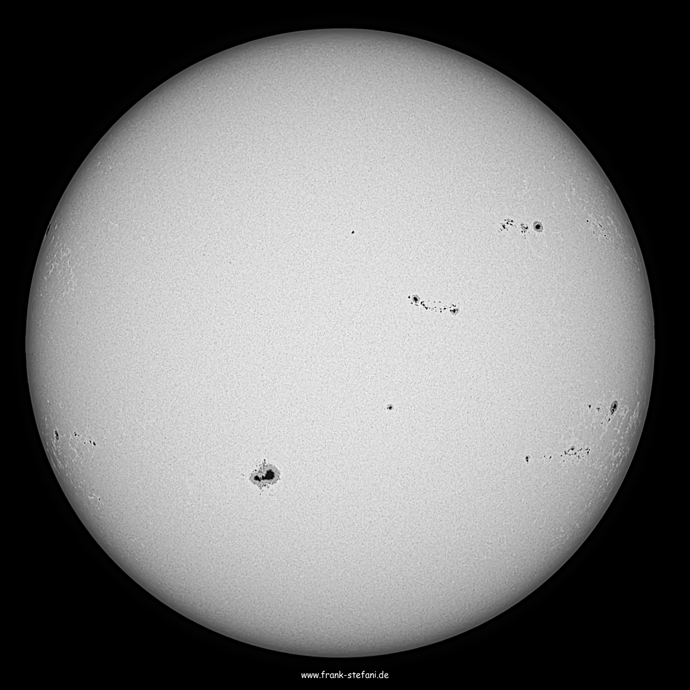 Weiterhin ist die Fleckengruppe der Aktiven Region AR13363 (unten links) besonders gut zu beobachten: Seit gestern bestehen weiterhin zwei haarfein wirkende granulare Lichtbrücken links der Mitte der tiefschwarzen Umbra. Vorgestern sah man dort sehr deutlich eine einzige kräftige Lichtbrücke (siehe: https://www.spektrum.de/alias/wunder-des-weltalls/sonnenflecke-am-09-juli-2023/2157996). Auch in allen weiter östlich (rechts) gelegenen ARs »sprudelt« es fleißig - alles ist in Bewegung und erinnert an Kohlensäure im Mineralwasser oder an kochendes Teewasser, wenn man sie die Entwicklung der letzten Tage im Zeitraffer anschaut.
