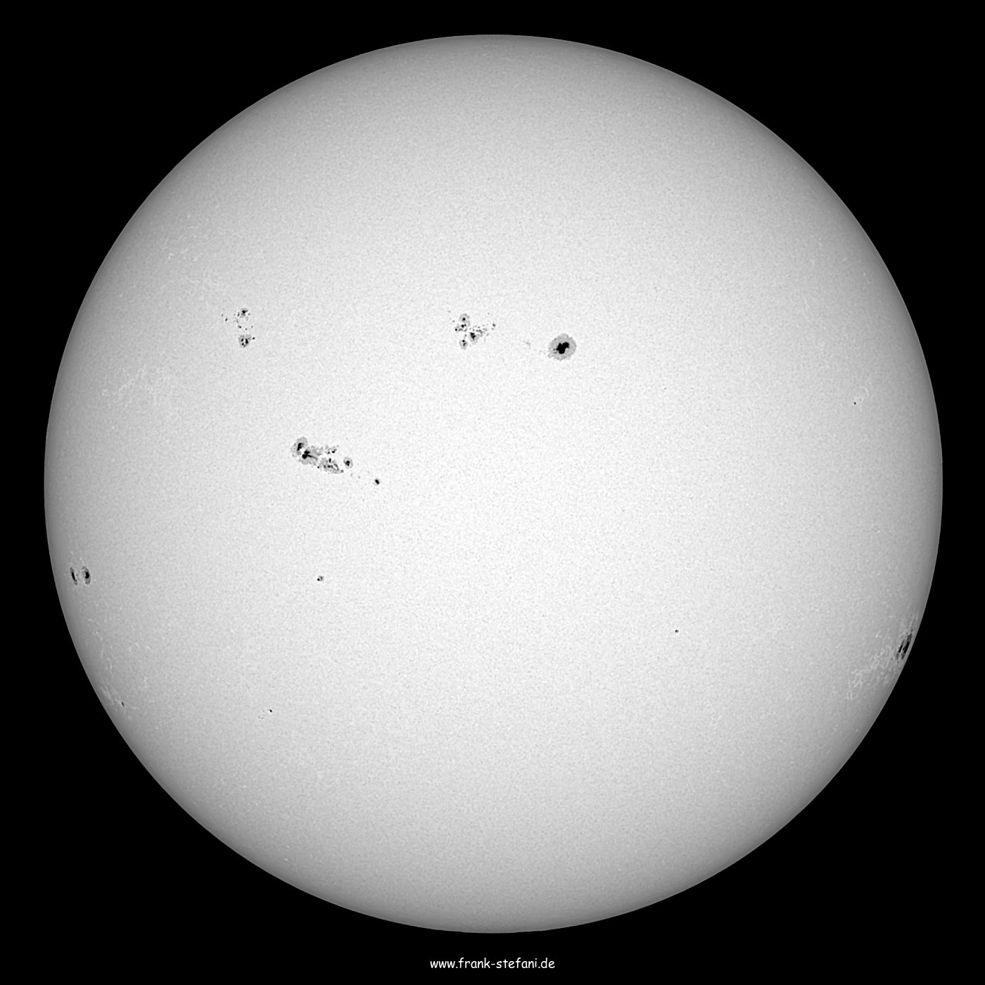 Auffallende Veränderungen im Großen und im Kleinen sind aktuell im Spektrum des sichtbaren Lichts auf der Sonnenscheibe zu beobachten - täglich und sogar stündlich entstehen und vergehen ganze Sonnenflecke oder deren Umbra, Penumbra, Lichtbrücken und andere Eigenschaften. Am interessantesten ist heute wohl die nur wenige Grad nördlich des Sonnenäquators liegende aktive Region AR13373. Nach offizieller Zählung enthält sie nicht weniger als 20 Sonnenflecke und insgesamt reichlich chaotische Umbrae. Dies trifft auch auf die etwas oberhalb liegenden aktiven Regionen AR13376 (links) und AR13372 (rechts) zu. Letztere hat außerdem einen großen, nahezu rund geformten Sonnenfleck hervor gebracht, der eine gleichmäßige, flächige Penumbra aufweist. Es ist auffallend, dass AR13372 gleichzeitig ein »Meer der Ruhe« rechts und ein chaotisch erscheinendes »Atoll« aus unzähligen Inselchen enthält. Ich vermute, dass das mit der Lage und Verteilung der Magnetpole zusammen hängen könnte - aber um das zu beurteilen, fehlt mir die Expertise. Die Betrachtung des aktuellen SDI HMI Magnetogramms (https://solarmonitor.org/data/2023/07/18/pngs/shmi/shmi_maglc_fd_20230718_055846.png) legt mir diese Idee nahe.