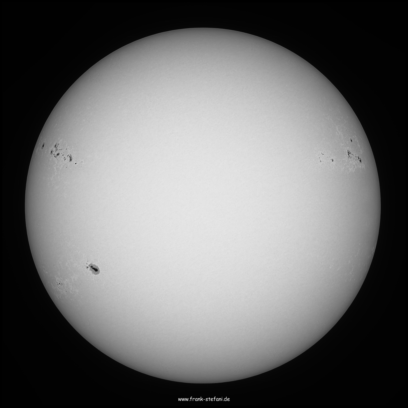Sonnenflecke am 20. Mai 2023 - durch Zirruswolken. Es sieht danach aus, als müsse ich mich mit dem anhaltend bedeckten, scheinbar nie wirklich klaren Himmel hier in den Alpen arrangieren: Seit fast drei Monaten scheint es aussichtslos, auf eine klare, Deep Sky taugliche Nacht zu hoffen. Immerhin ist die Sonne ein willkommenen Ziel, denn die Chancen auf eine zufrieden stellende Bildserie aufgrund der erforderlichen sehr kurzen Belichtungszeiten, stehen deutlich besser. Sehr erfreulich, dass es durch die wachsende Sonnenaktivität in diesem 25. Sonnenflecken Zyklus wirklich viel zu beobachten gibt, das man zudem auch noch vergleichsweise unaufwändig im Spektrum des sichtbaren Lichtes fotografieren kann. Durch den milchigen Himmel und das schlechte Seeing konnte ich in der Ausarbeitung nicht einmal einen Hauch der Granulation der Sonne dokumentieren. So habe ich mich auf die Bereiche der Randabdunklung konzentriert und neben den schönen größeren Flecken auf beiden Hemisphären - der größte davon sogar mit einer Lichtbrücke - einige der dortigen Fackelgebiete heraus gearbeitet.