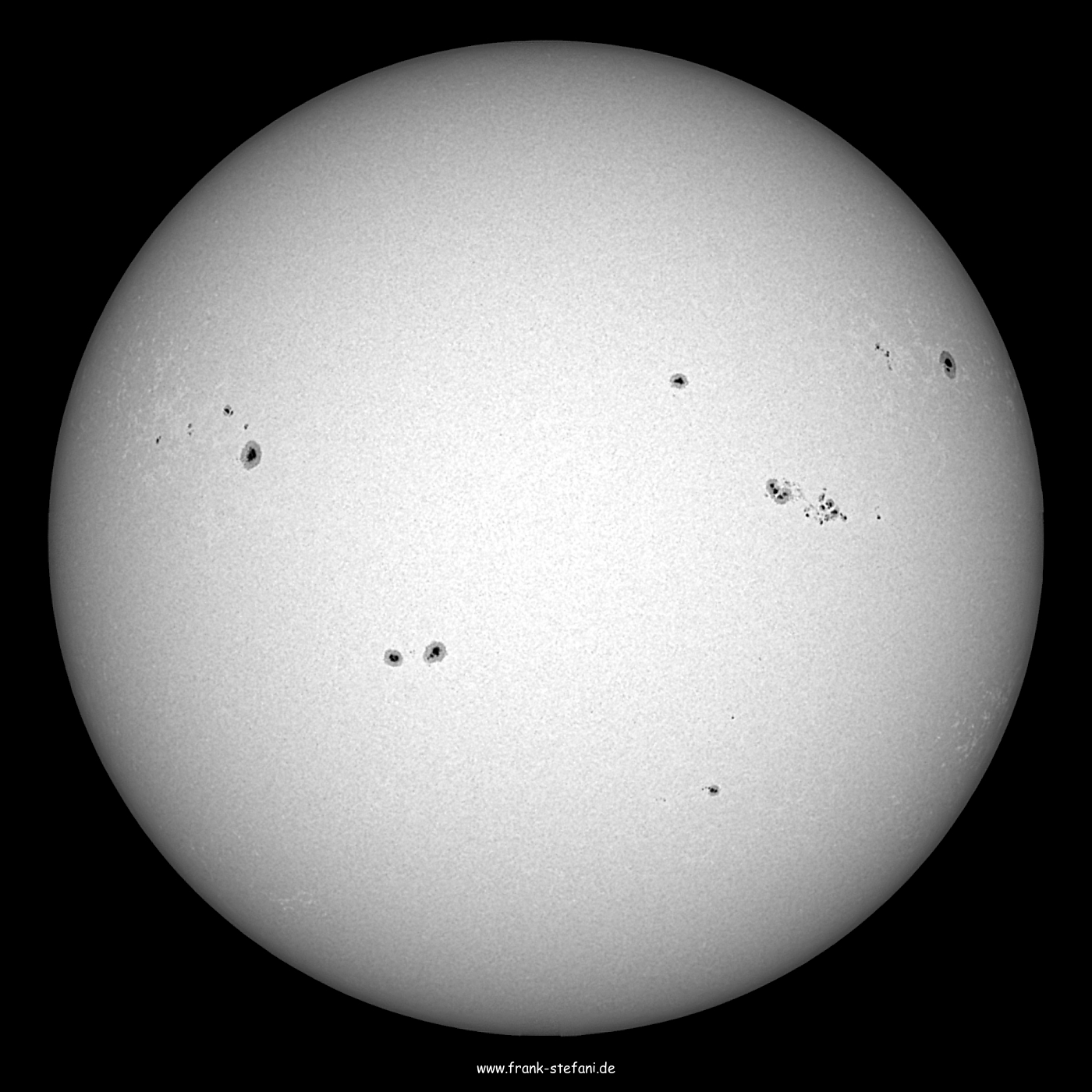 Mein »täglich Brot« ist die scheinbar konstante Bewölkung hier in den Alpen. Oftmals stehe ich vor der Herausforderung, die Sonne durch die chaotisch quellenden Wolken überhaupt zu finden, weil der Sonnenfilter nichts als Schwarz zeigt (siehe: https://www.astrobin.com/l0g86s/#rB) und selbst der Lacerta-Sonnensucher keinen hellen Sonnenpunkt auf sein Mattglas projiziert. So auch heute: Die mobile Nord-Süd-Ausrichtung der Montierung gelingt bei Tage sowieso nur ungefähr - ein GoTo liegt immer daneben - und obendrein bleibt das FireCapture Livebild durch den aufgesetzten Sonnenfllter tief schwarz. Nachdem ich die Sonne endlich in der vorgesehenen ROI zentriert und die Montierung synchronisiert habe, muss ich erneut geduldig auf ein kleines blaues Loch zwischen den Wolken warten (siehe Animation: https://www.astrobin.com/l0g86s/#rC), um dann so schnell wie möglich meine Aufnahmeserie mit geplanten 1000 Bildern zu starten. Am Ende schaffe ich gerade mal 500 Bilder – dann ist alles wieder dicht. Dem Resultat sieht man das zermürbende Hoffen und Warten jedenfalls nicht an – wie schön!