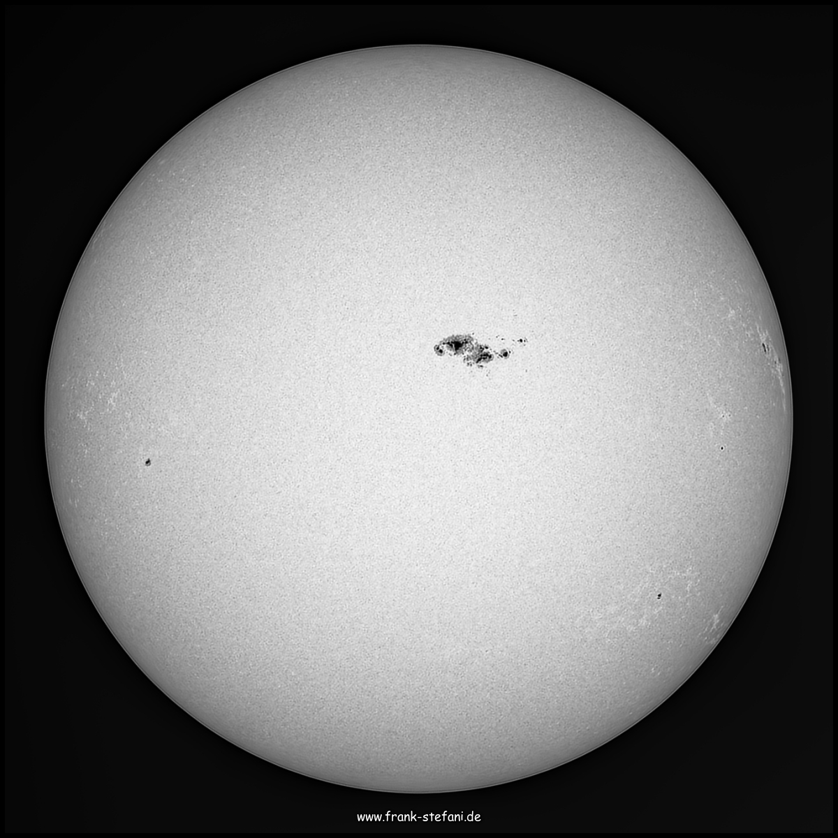 Die hier absolut überragend erscheinende aktive Region AR13354 hat sich in den vergangenen Tagen rasant aus dem »Nichts« entwickelt. Eine Augenweide, ihre vielen Details in Augenschein zu nehmen: Mehrere Lichtbrücken durchziehen sowohl einige Umbrae als auch mindestens eine Penumbra. Es ist ein regelrechtes Gewimmel, welches nur zu gut veranschaulicht, dass auf der Sonne gerade sehr viel los ist. Ausgedehnte wild mäandernde Fackelgebiete in den Regionen der scheinbaren Randabdunkelung, sowie die körnig erscheinende Granulation der Photosphäre runden das Gesamtbild ab. Besonders erfreut hat mich, dass ich alle Phänomene auch visuell beobachten konnte. Und die große AR13354 war sogar mit den bloßen Augen durch die gute alte SoFi-Brille von 1999 zweifelsfrei zu sehen!