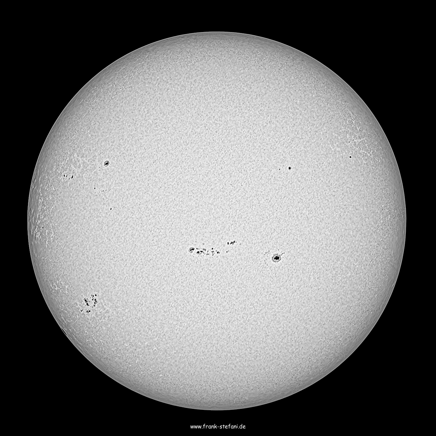 Seit 26. Mai 2023 ist heute, nach tief grauen Tagen im Nordstau der Alpen, endlich mal wieder der Himmel frei. Das Seeing ist nicht gut, aber wenigstens ist die Sonne am blassblauen Himmel nicht von zirrus- oder Kumuluswolken verdeckt. Mit FireCapture nehme ich eine Serie von 1000 Bilder auf, von denen ich 200 mit Drizzle-Integration stacke. Die Nachbearbeitung habe ich diesmal etwas forscher betrieben, um neben der Granulatur der Sonnenoberfläche auch die Fackelgebiete in der Randabdunkelung besser hervor zu heben. Ebenfalls nur selten gelingt es mir, mehrere Helligkeitsstufen und sogar Fasern in den Penumbren nachzuweisen – alles im Spektrum des sichtbaren Lichts, lediglich durch die Baader Astrosolarfolie.