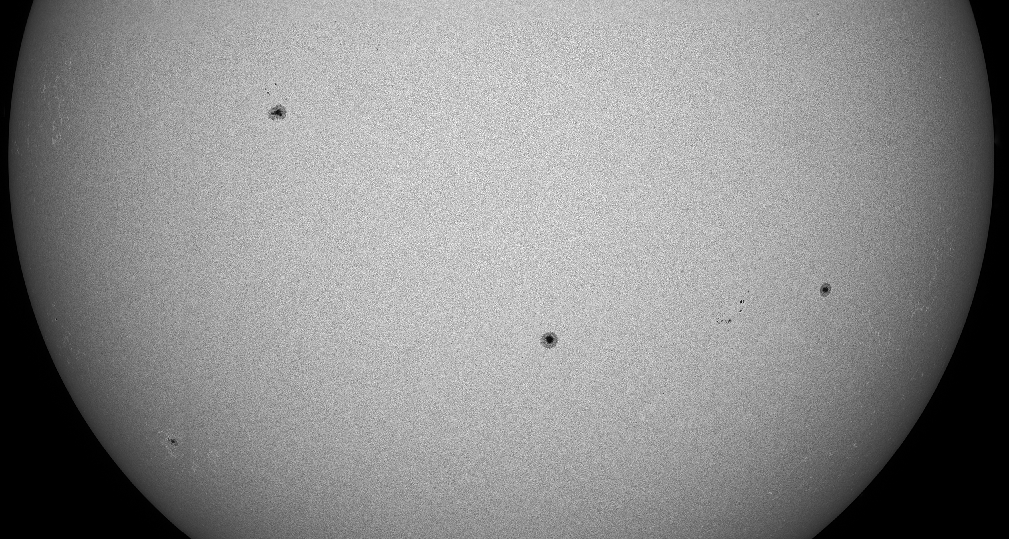 Das Bild zeigt die Sonnenfleckengruppen um 07:29 UT am 11. August 2022. Norden ist oben und Osten links. Visuell konnte ich an diesem Morgen acht Gruppen mit total 28 Flecken zählen. Das Zählen der Gruppen und Flecken dient zur Erfassung der Sonnenaktivität nach Rudolf Wolf.