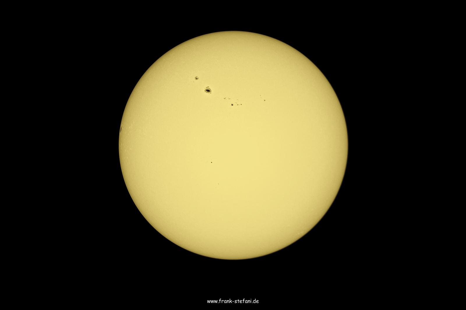 Obwohl wir noch mehr als drei Jahre vom Maximum des aktuell 25. Sonnenzyklus (elfjähriger Schwabe-Zyklus nach Samuel Heinrich Schwabe) im Jahre 2025 entfernt sind, gibt es doch schon aktive Regionen mit Sonnenflecken, die man sogar mit bloßen Augen – beispielsweise durch eine noch vorhandene SoFi-Brille oder durch ein Stück Astrosolarfolie – sehen kann. Heute gab es nicht nur einen großen Fleck, der eine schöne ausgeprägte Penumbra zeigt. Es kündigt sich außerdem bereits ein zweiter, ähnliche großer Fleck und ebenfalls mit Penumbra am linken Sonnenrand an, der sich aufgrund der Eigendrehung der Sonne in den nächsten Tagen weiter zur Mitte der Sonnenscheibe hin bewegen wird. Dadurch, dass ich mit vergleichsweise kurzer Brennweite fotografiere, wird zudem die Größe der Sonnenflecken im Verhältnis zur gesamten Fläche der Sonne offensichtlich. Unsere Erde wäre, würde sie direkt neben der Sonne stehen, etwa so so groß wie der kleine Sonnenfleck unterhalb der Mitte der Sonnenscheibe zu sehen.
