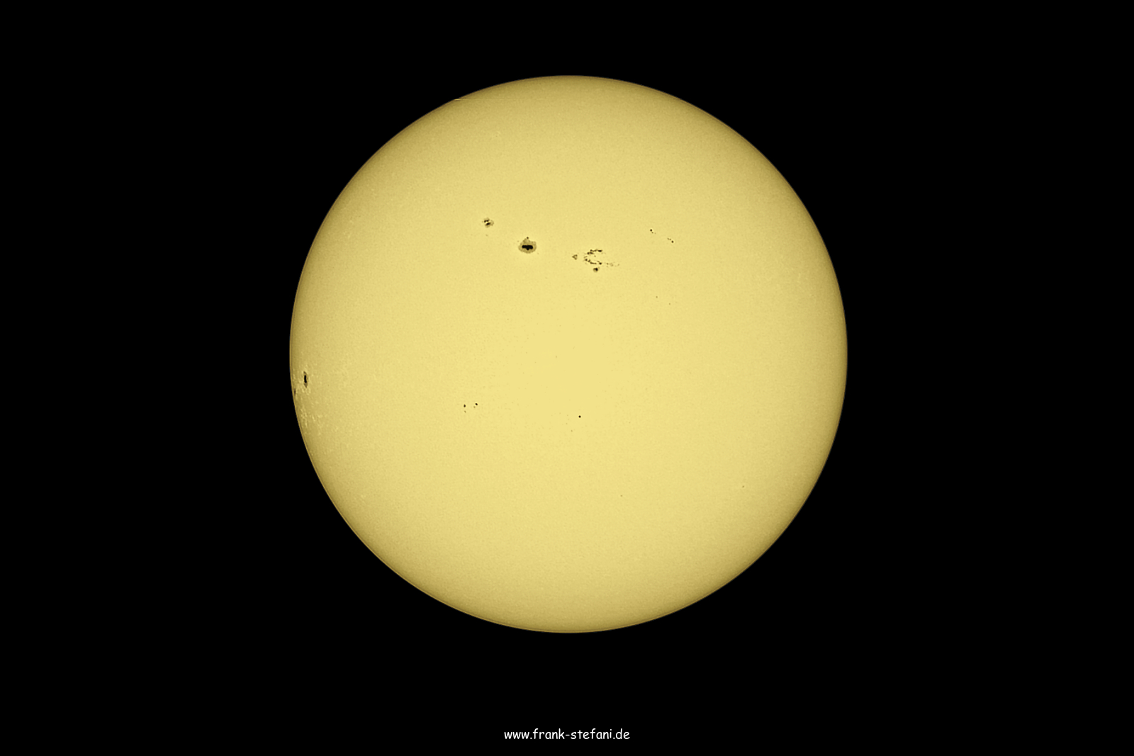 Perfekte ruhige Atmosphäre, gutes Seeing und Transparenz, um die Sonne zu fotografieren. Diese zeigt heute fantastisch schöne und gestochen scharfe Sonnenflecken in vielen Formen und Größen. Links am Rand kommen außerdem noch größere Flecken um die Ecke, die allesamt in den nächsten Tagen weiter zur Sonnenmitte und zum rechten Rand hin wandern werden. Mit der guten alten "SoFi-Brille", die vielleicht noch irgendwo in einer Schublade liegt, kann man diese Flecken sogar mit bloßen Augen (also: ohne Vergrößerung) sehen! ACHTUNG: Nie ohne geeigneten Filter direkt in die Sonne schauen!