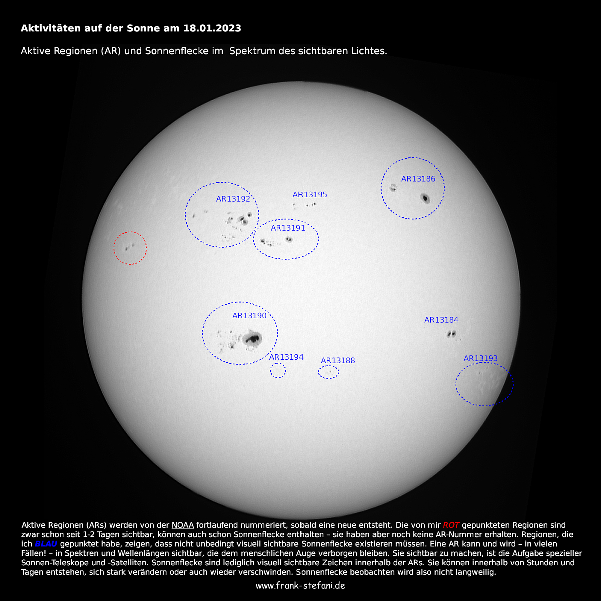 Zur Zeit gibt es auf der Sonne besonders viele Sonnenflecke in unterschiedlichen Größen und auch sehr detailreich zu beobachten. Ich verfolge die Entwicklung gerne auf https://solarmonitor.org/ – vor allem, weil sich hier im Nordstau der Alpen seit etlichen Wochen kaum brauchbare Bedingungen für Deep-Sky-Fotografie ergeben haben. Für die Sonne und den Mond genügen bereits wenige Minuten in einem hinreichend großen Wolkenloch, um eine Bildserie zu fotografieren, die auch bei mäßigem Seeing auf ein erfreuliches Bildresultat hoffen lässt. Am 18. Januar 2023 war das Seeing seit Ende Oktober 2022 endlich mal wieder brauchbar und das passende Wolkenloch gab am Vormittag für gut eine Stunde den Blick auf die Sonne frei. Mit Firecapture auf meinem Astroberry fotografierte ich vom Fotostativ aus – also ohne Nachführung / Montierung – mit der ZWO ASI533MC Pro 1000 Bilder mit jeweils 0,032ms (=0,32µs) Belichtungszeit, um Seeing-Effekte zu minimieren. Weil nach so langer »Himmels-Abstinenz« das Fotografieren endlich mal wieder Freude bereitete, vertiefte ich anschließend mein Erfolgserlebnis noch etwas, indem ich eine Legende der aktiven Regionen (AR), sowie einen kurzen erläuternden Text einarbeitete.