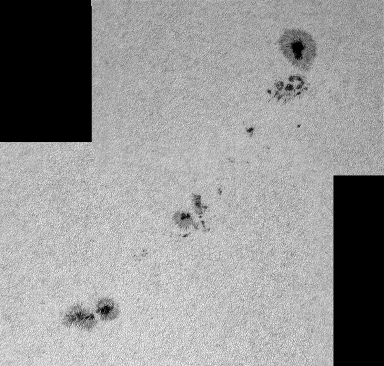 Das Fleckengebiet ist mittlerweile so groß, dass ein Mosaik aus zwei Bildern her musste. Ein Vergleichsbild im H-Alpha-Licht machte die dichte Wolkendecke des ohnehin milchigen Himmels gänzlich zunichte.
