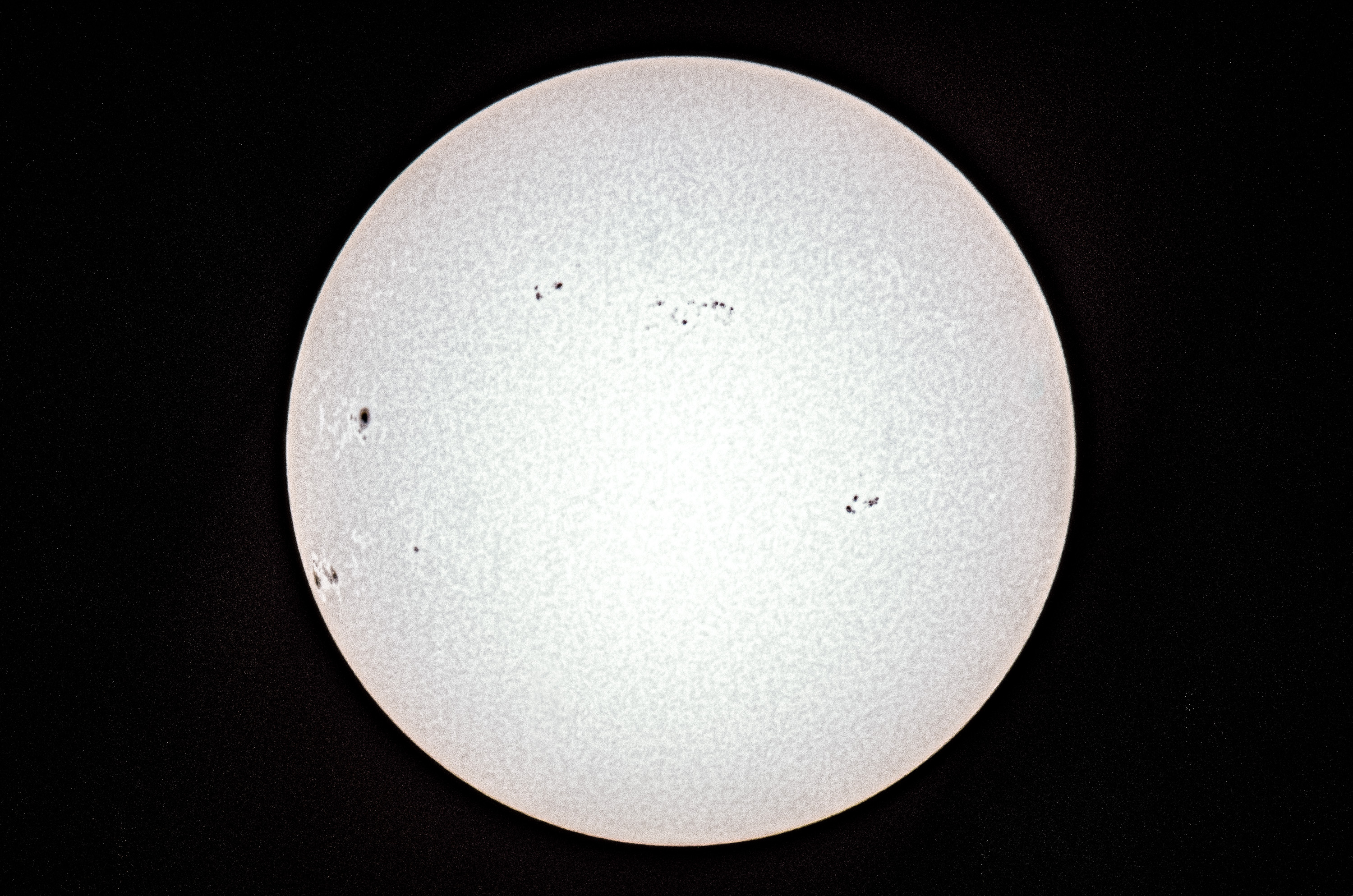 Ein Tag nach der teilweisen Sonnenfinsternis war der Himmel klar und ich konnte die Sonne im Weisslicht mit fotografischen Mitteln abbilden. Im Workflow bei der Nachbearbeitung kann ein hoher Dynamikumfang ausgewertet werden, so dass auch die durch die Magnetfelder verursachte Oberflächenstruktur erkennbar ist.
