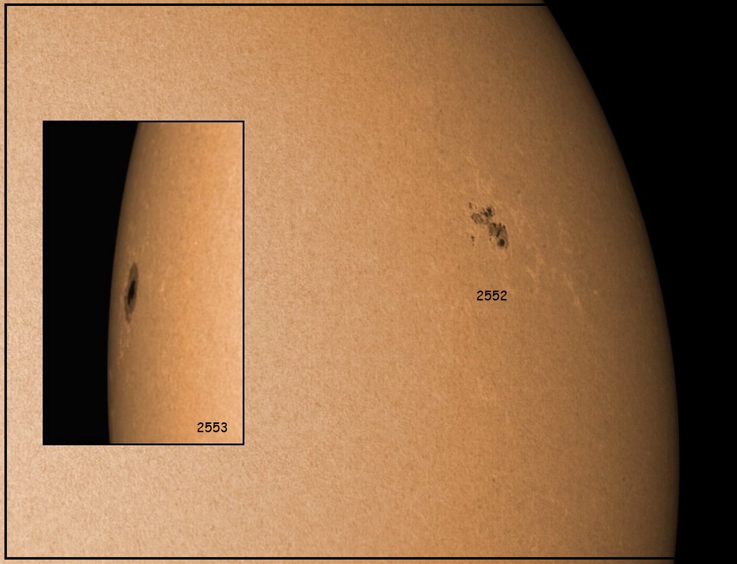 Das miserabele Wetter allabendlich hat mich dazu verleitet gestern als endlich mal wieder für kurze Zeit die Sonne schien, letztere mal wieder im Weisslicht näher zu betrachten. Einer der kommt und einer der geht... die Flecken 2552 und 2553