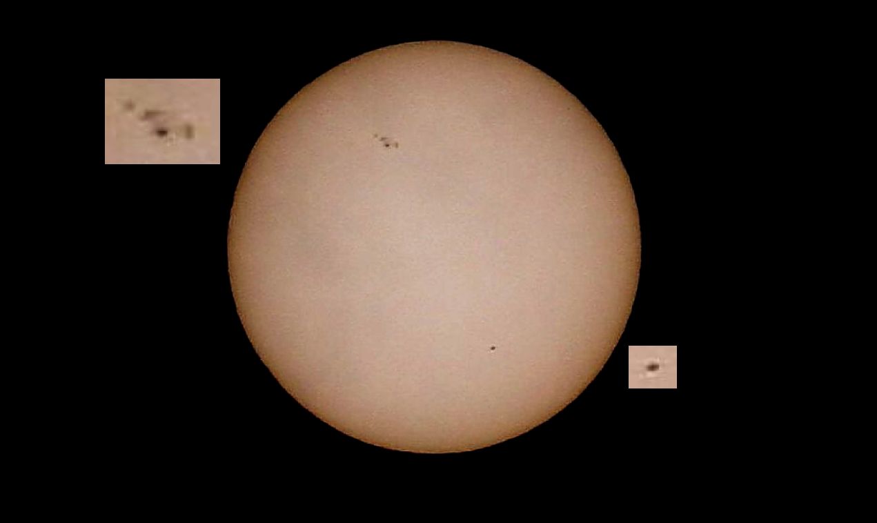 Freitag, 28. Januar 2022, wolkenfrei, zirka 12:30 Uhr. Die Sonne war gut sichtbar. Kamera und Sonnenfilter geholt, und mehrere Sonnenbilder gemacht. Es sind einige Sonnenflecken zu sehen.