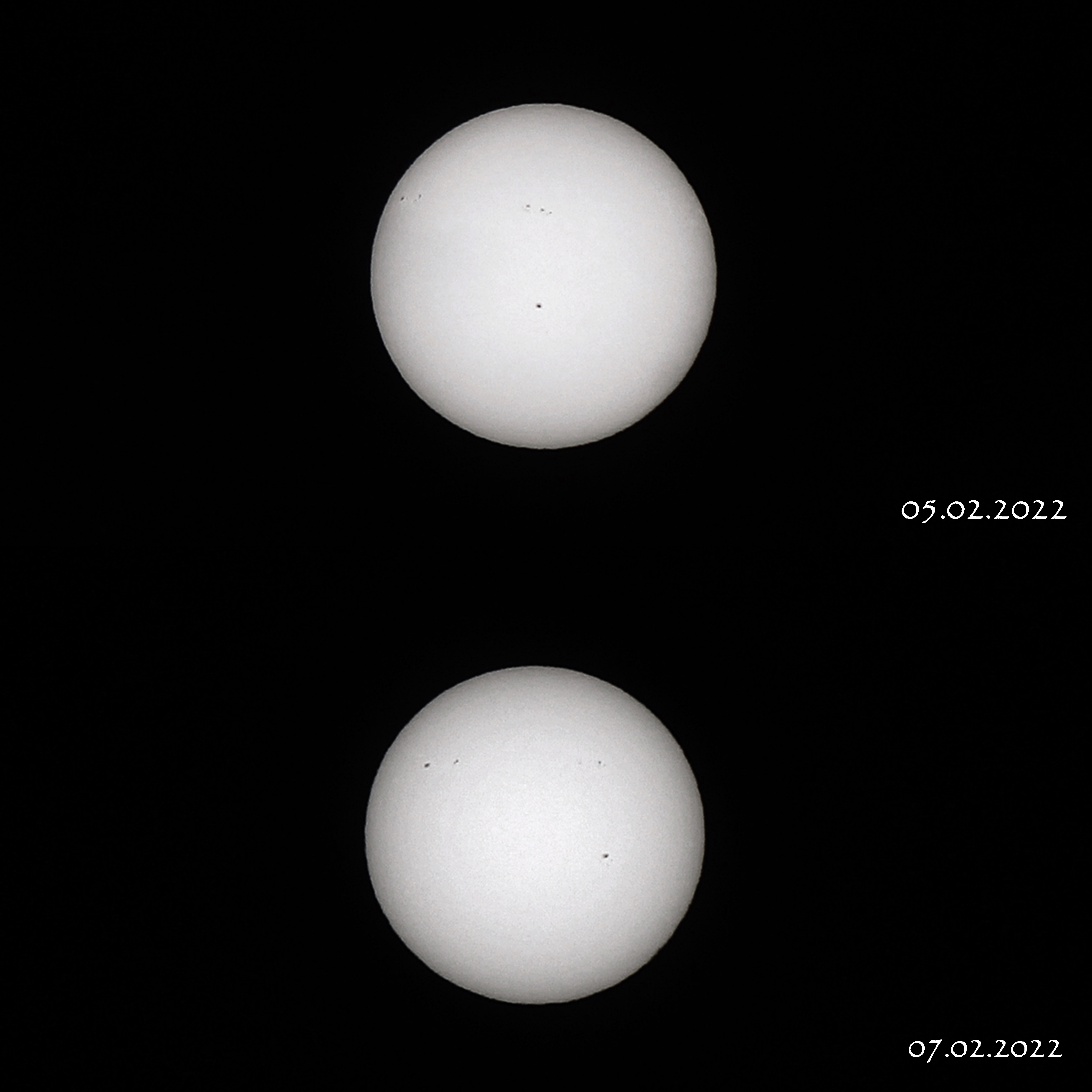 Eine Zusammenfassung von zwei Beobachtungen und zwei Fotos. Am 5. Februar 2022 um 11:22 Uhr MEZ und am 7. Februar um 10:26 Uhr MEZ. Zu sehen sind AR 2941, AR 2940 und AR 2939.