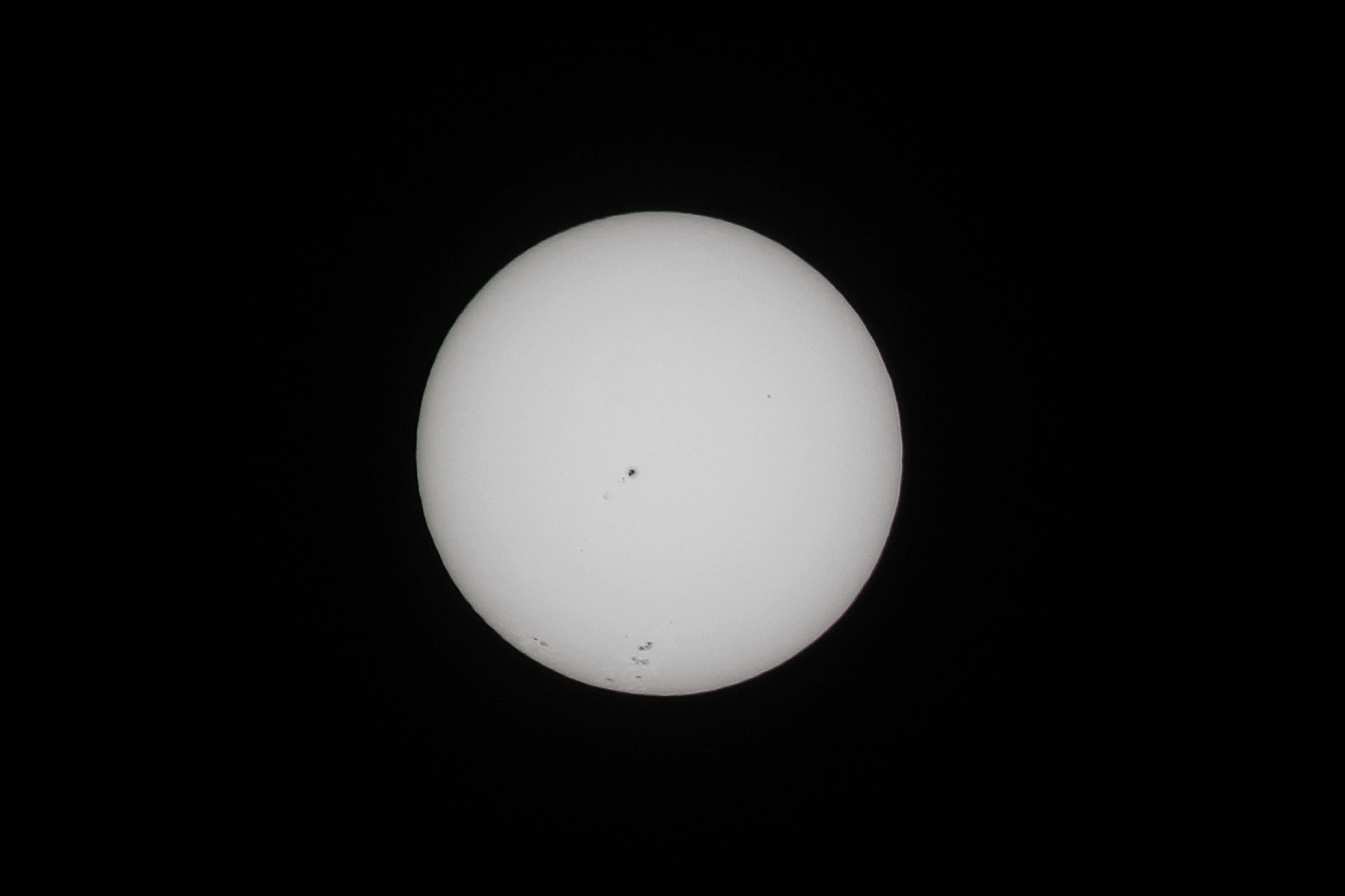 Heute Morgen beobachtete ich die Sonne mit meinem P.S.T. in H-Alpha und fotografierte die Sonne im Weißlichtbereich. Aufnahmeort war meine Balkonsternwarte.
