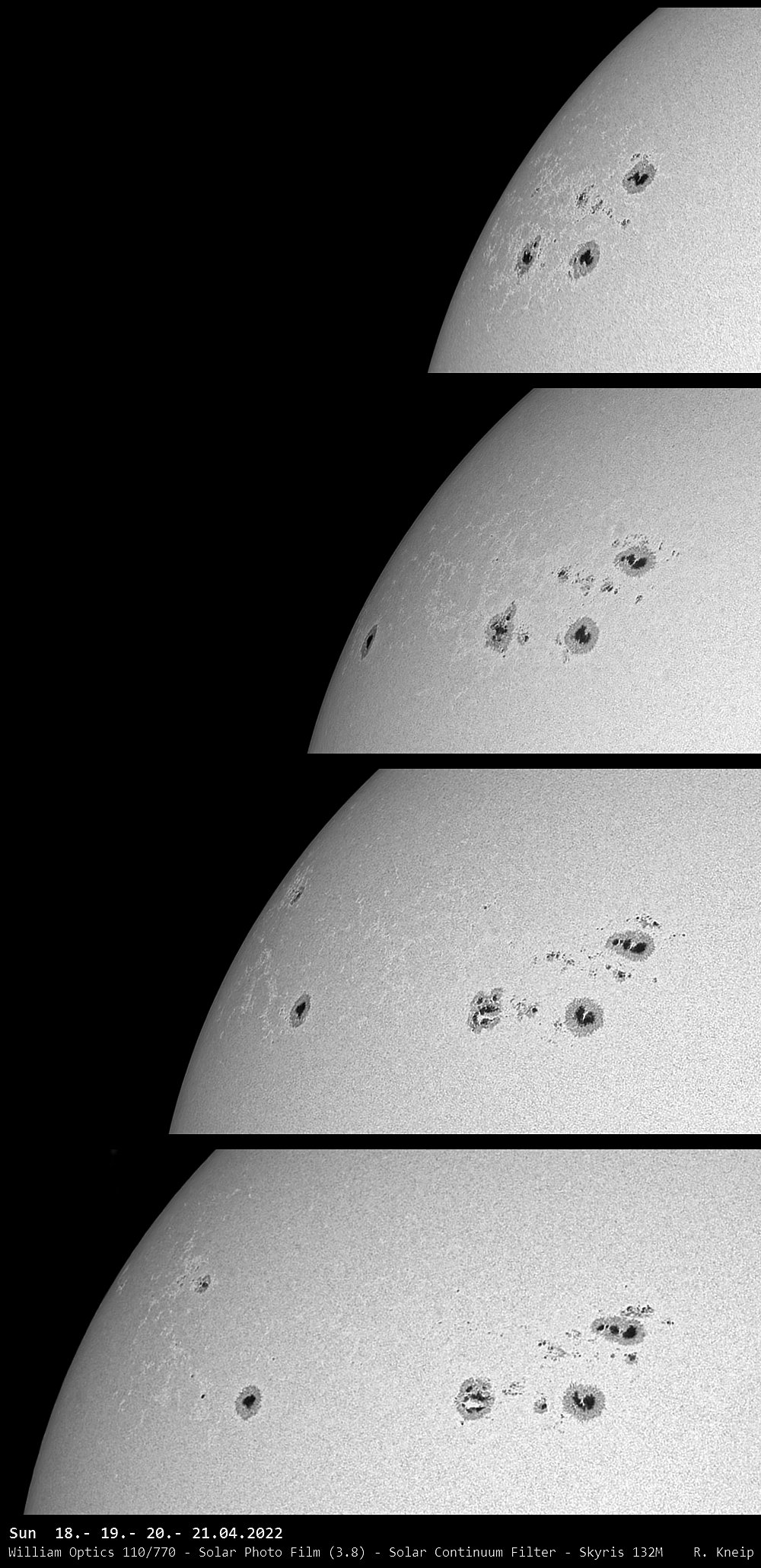 Auftauchen der Sonnenfleckengruppe zwischen dem 18. und 21. April 2022. Alle Aufnahmen mit William Optics 110/770, Folienfilter, Kontinuumfilter und Skyris 132M. In PIPP, Autostakkert und Pixinsight verarbeitet