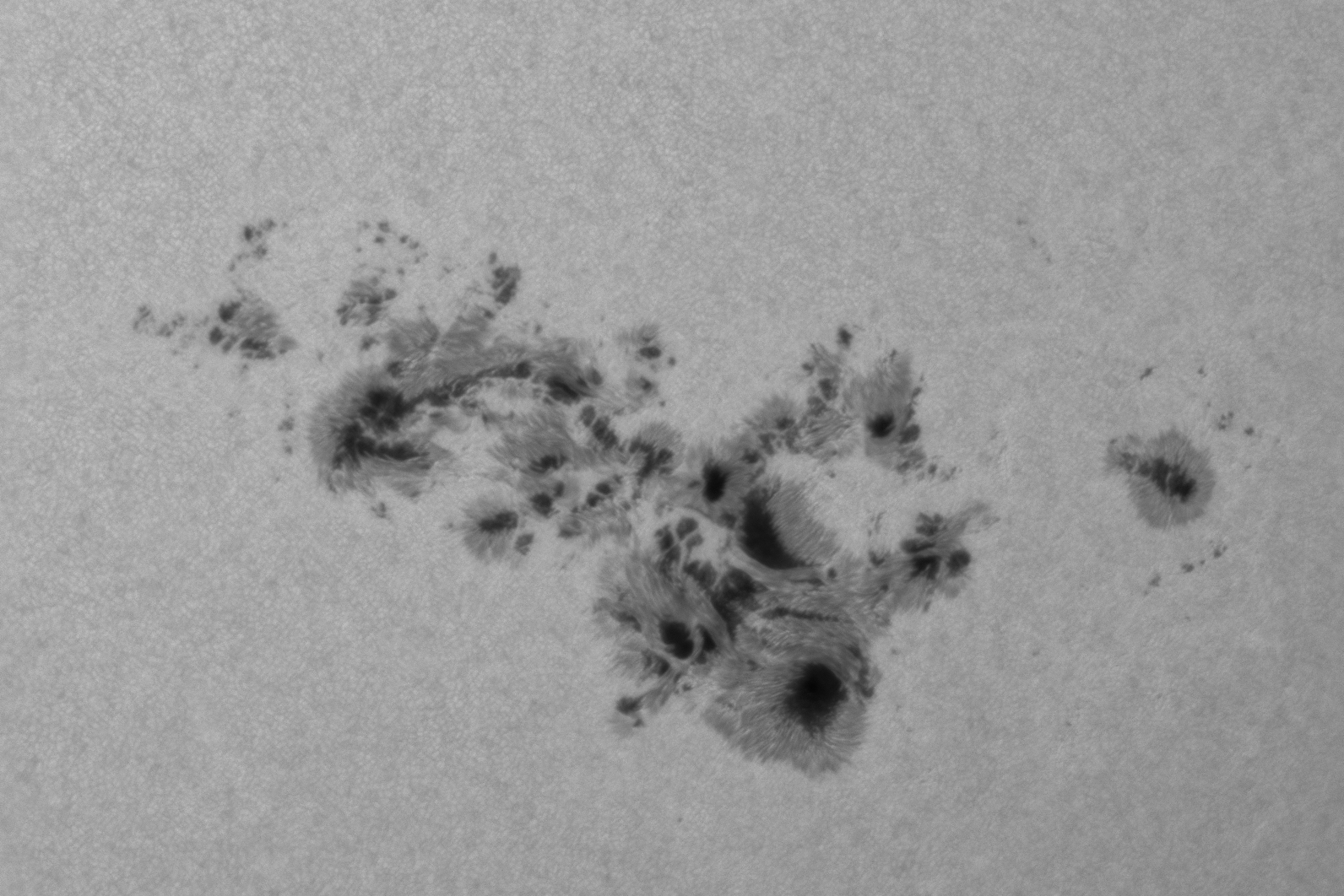 Die große Sonnenfleckengruppe AR 3664 am 9. Mai 2024. Die Aufnahme wurde mit einer 2x TeleVue Powermate und einem TeleVue Korrektor gemacht. Belichtet wurde durch ein Astronomik-Rotfilter. Es wurden 80 Einzelbilder addiert.