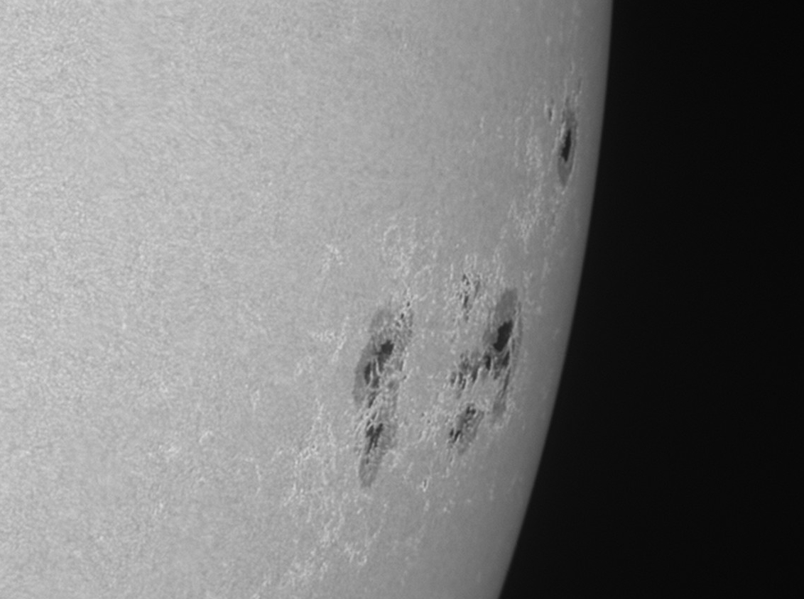 Am 8. Juli zeigte sich die Sonne sehr aktiv. Eine Sonnenfleckengruppe erschien am Ostrand, während sich die andere am Westrand verabschiedete. Ich versuchte, zuerst mit meinem Vixen Acht-Zentimeter-Refraktor, dann aber mit dem Fünf-Zoll-Starfire-Refraktor von Astrophysics maximale Details herauszuholen. Die Überlegenheit des Auflösungsvermögen des Starfire-Refraktors war offensichtlich. Hier zuerst die Gruppe West AR 11515,
