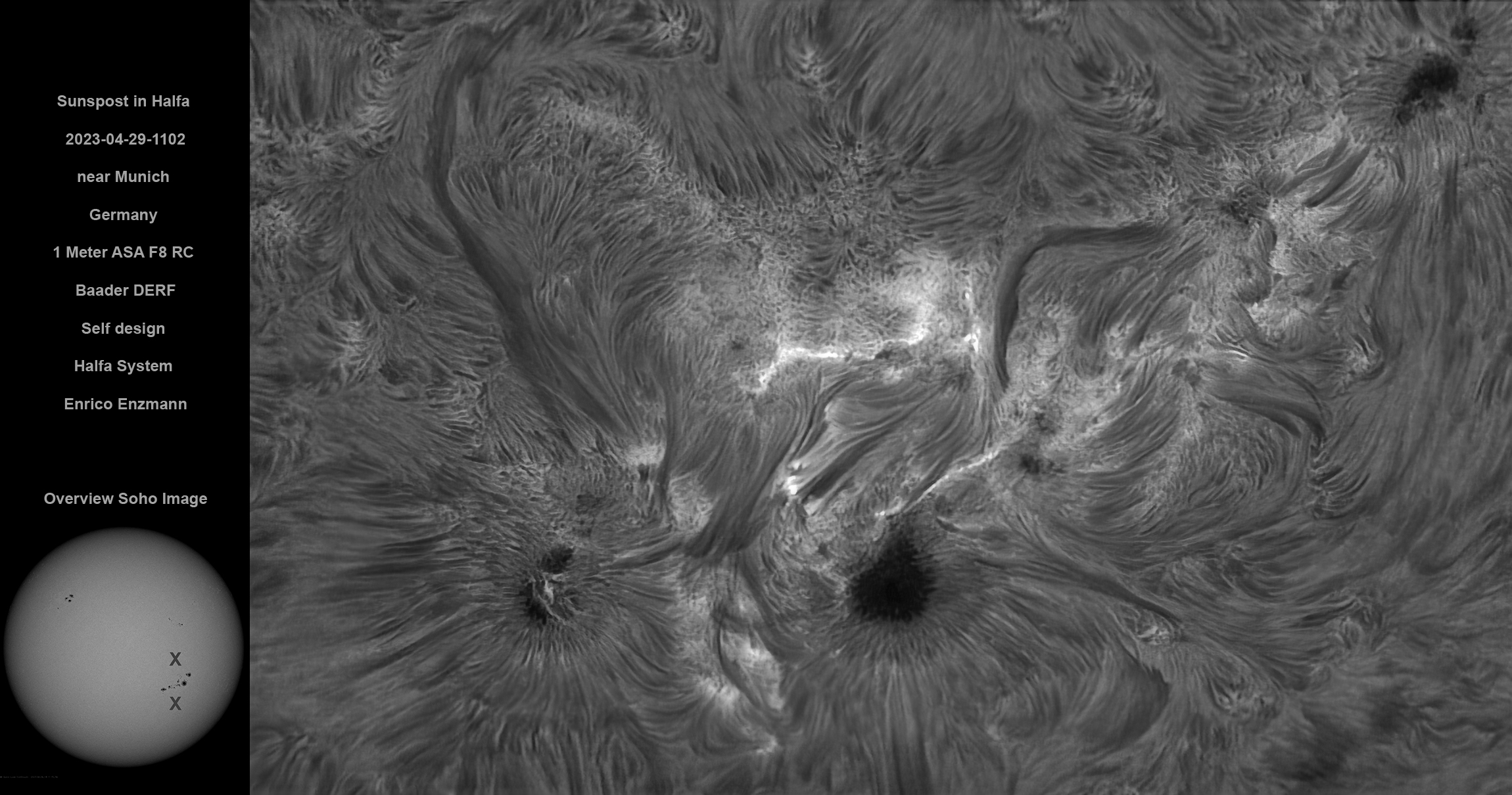 Am 29. April 2023 hat es südlich von München viel geregnet und meist war es auch bewölkt. Mehrere Male klarte es aber für ein paar Minuten auf. Stellenweise war dabei das Seeing recht gut. Die große Fleckengruppe, siehe auch das Soho-Übersichtsbild, war dabei ein lohnendes Objekt, das viele Details der Sonnenoberfläche zeigt.
