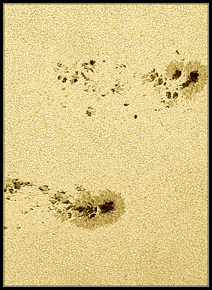 Am Pfingstmontag um 12:59 Uhr MESZ entstand diese Aufnahme der Sonnenfleckengruppen 2080 und 2085. Die atmosphärischen Bedingungen am Pfingstwochenende machten hochauflösende Sonnenfotografie möglich - selbst aus der Großstadt Hamburg heraus.