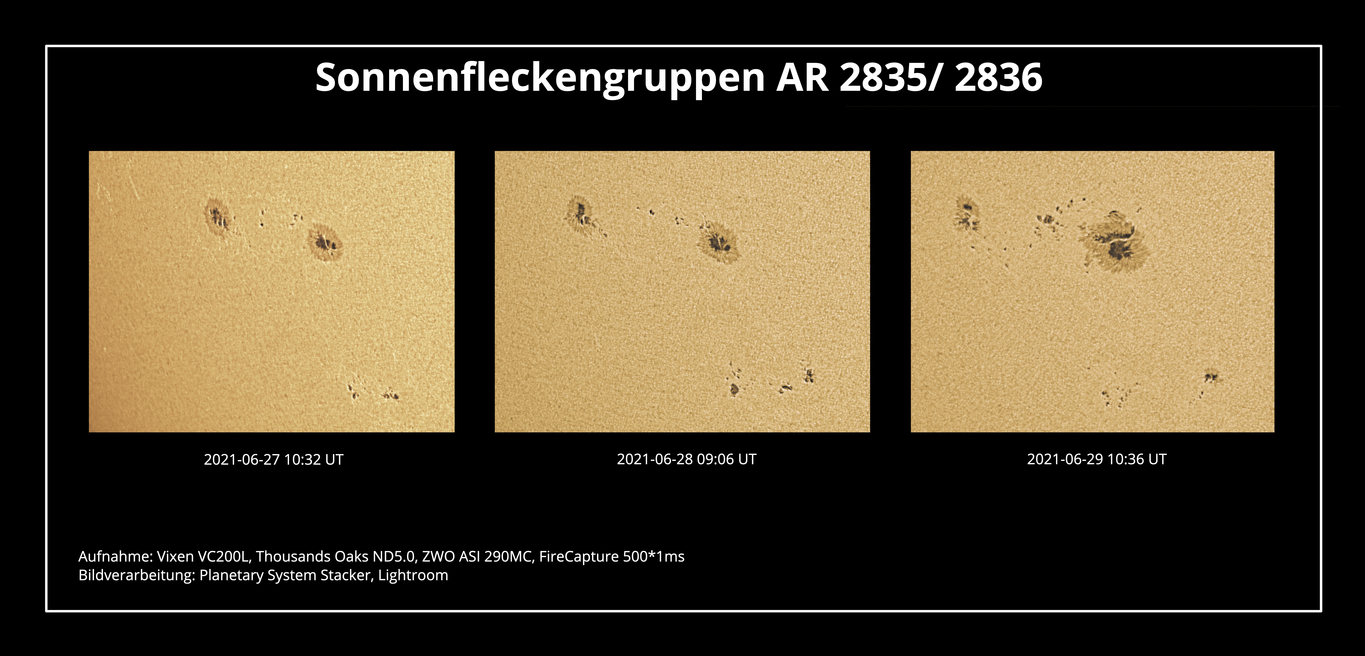 Entwicklung der Fleckengruppen AR2835/36 über drei Tage.