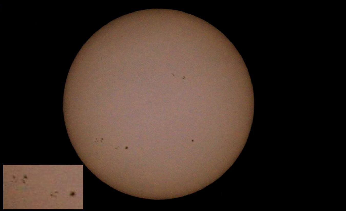 Montag 6 Sep. 2021, 16:30. Kamera mit Sonnenfilter mont. In die Sonne gesehen dabei mehrere Sonnenfleckengruppen entdeckt. Zwei dieser Gruppen sind neu, die anderen waren sch Samstag da.Ich machte einige Bilder, eins sende ich hier ein. Immer Sonnenfilter nehmen bei Sonnen ausnahmen.