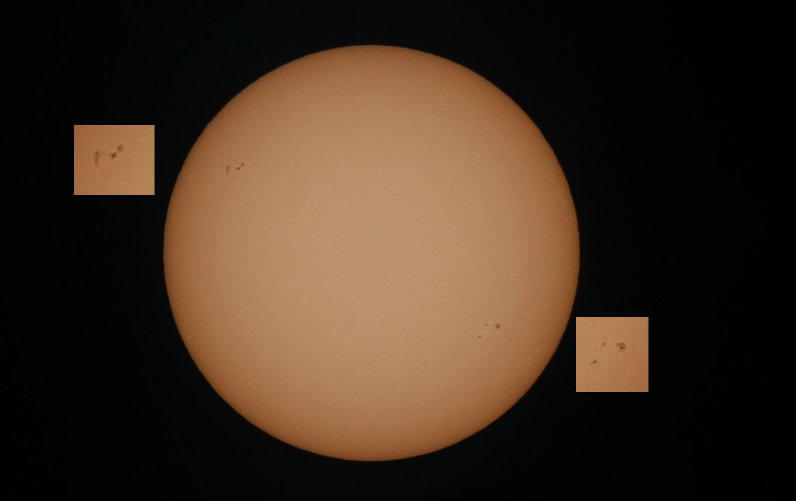 Mittwochnachmittag nach Gewitter und Regenschauer reißen die Wolken auf und die Sonne kommt klar heraus. Ich hole schnell meine Kamera und mache einige Aufnahmen. Es sind zwei große Sonnenfleckengruppen zu sehen. Noch größer als vorige Woche. Nie ohne Sonnenfilter die Sonne aufnehmen.