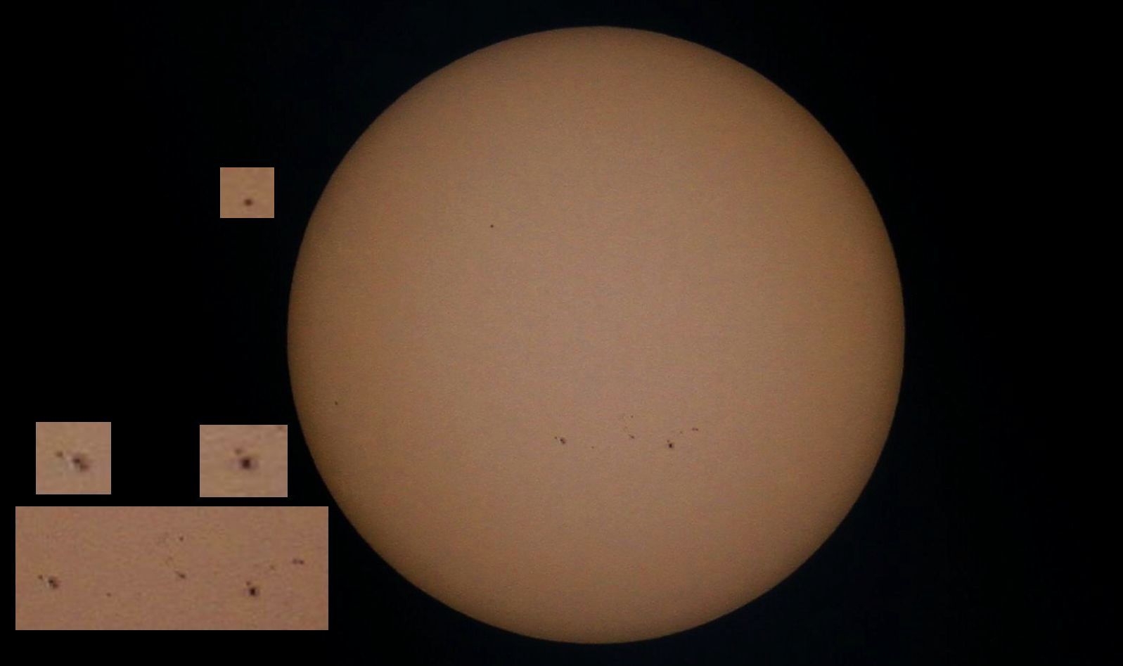 Als ich mit dem Rad nach einer Tour durch unser Naturschutzgebiet (Greifvögel) zurück kam, sah ich die Sonne wolkenfrei am Firmament. Canon-Kamera mit Sonnenfilter geholt und einige Fotos gemacht. Eins sende ich euch ein, mit Fleckenvergrößerung.