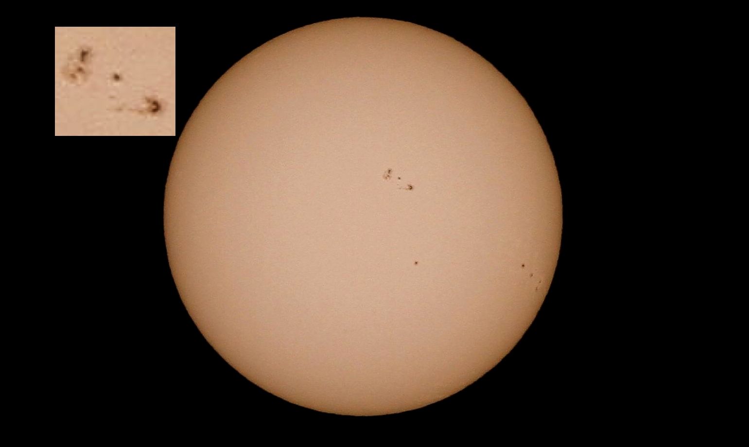 Die Regenwolken verschwanden und die Sonne kam mit voller Pracht. Es waren viele Sonnenfleckengruppen zu sehen. Kamera mit Filter geholt und etliche Bilder gemacht. Eins zeige ich hier. Mehr auf: https://www.foto-literatur-planet.eu/astofotos-direkt/