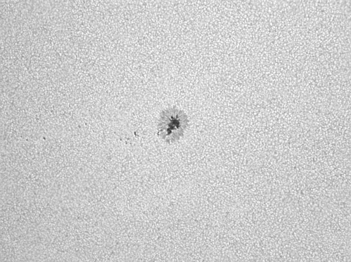 Hier versuchte ich die Sonnengranulation detailliert aufzunehmen. Im Kopf hatte ich eine Aufnahme des französischen Astonomen J. Jannsen von 1885. Sie war so scharf, dass er darunter schrieb: "Obtenue sans acune intervention de la main humaine"(Erhalten ohne jegliche Einschaltung der menschlichen Hand. Der etwa erdgroße Sonnenfleck mit Hof diente mir zur Fokussierung.